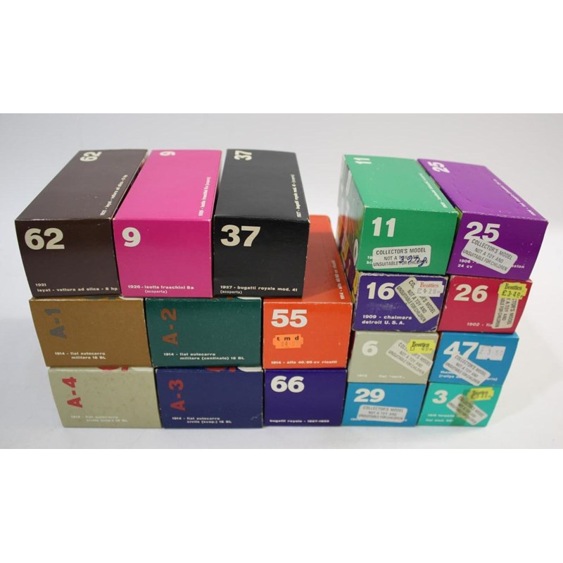 17 boxed models including A4 1914 Fiat Autocarro, A1 1914 Fiat, 9 1926 Isotta, 62 Vettura, A2 1914 Fiat Autocarro, A3 1914 Fiat, 55 1914 Alfa, 66 Bugatti Royale and other models. (17)