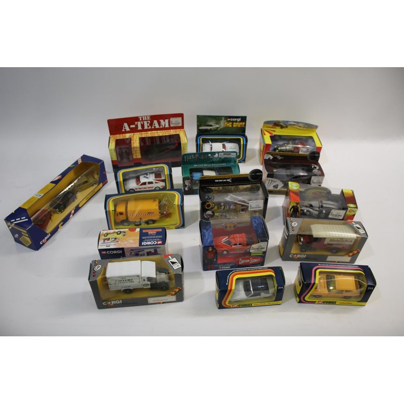 various boxed die cast toys including Corgi 320 The Saint, 1117 Road Sweeper, 5301 Chitty Chitty Bang Bang, 339 Rover Police, Harry Potter Ford Anglia, 87502 The A Team, 3801 James Bond Aston Martinm, 4602 Gyrocopter, Captain Scarlet, C18/1 Mini Racers, 314 Fiat Bertone, 315 Lotus Elite etc. (16)
