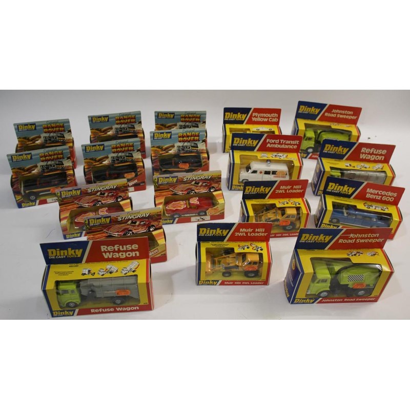 18 boxed models including 203 Customised Range Rover (x6), 278 Plymouth Yellow Cab, 128 Mercedes Benz 600, 206 Customised Stingray (x3), 978 Refuse Wagon (x2, green cab and grey body), 449 Johnston Road Sweeper, 276 Ford Transit Ambulance, etc. (18)