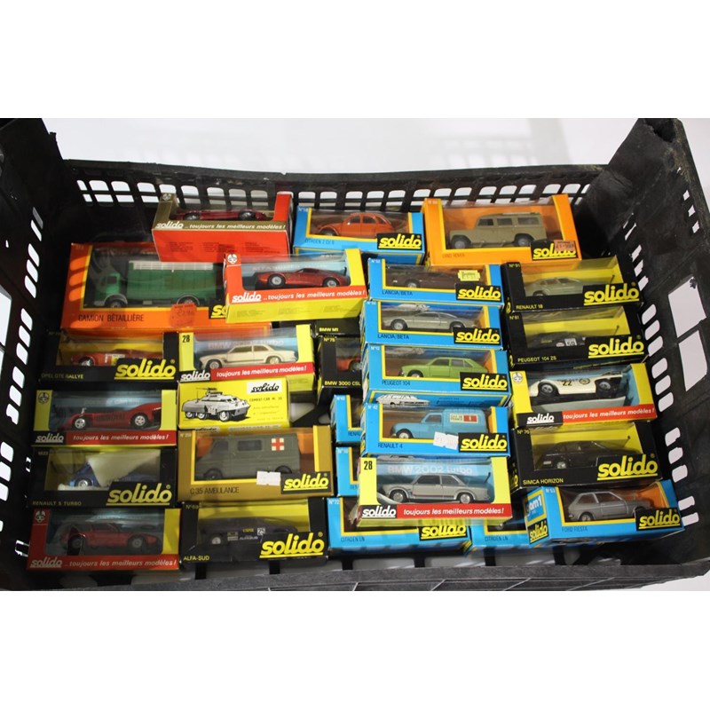 approx 35 boxed cars, military and other vehicles. Including 373 Camion, 70 Opal GTE, 18 Porsche Can, 1023 Renault 5, 183 Alfa Romeo, 28 BMW 2002, 256 Jeep Willys, 200 Combat Car, 259 C35 Ambulance, 66 Land Rover (x2), 192 Alpine Renault, and many more.