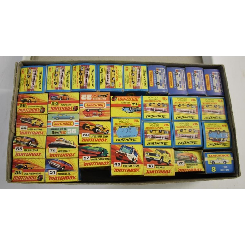 32 boxed cars and buses including 8 Ford Mustang (white body and red interior), 18 Field Car, 20 Lamborghini, 46 Stretcha Fetcha Ambulance, 51 Citroen SM, 52 Dodge Charger, 56 Mercedes, 60 Lotus Seven, 66 Mazda, 56 Pinifarina, 44 Boss Mustang, 54 Ford Capri etc.