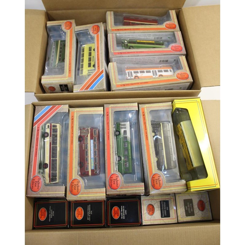2 boxes with approx 52 boxed model buses, including 25709 Citybus, 18012 East Yorkshire, 38126 Ribble, 14605 London Country, 15110 SELNEC, 35702 Greenline, 16534 Northern, and other models.