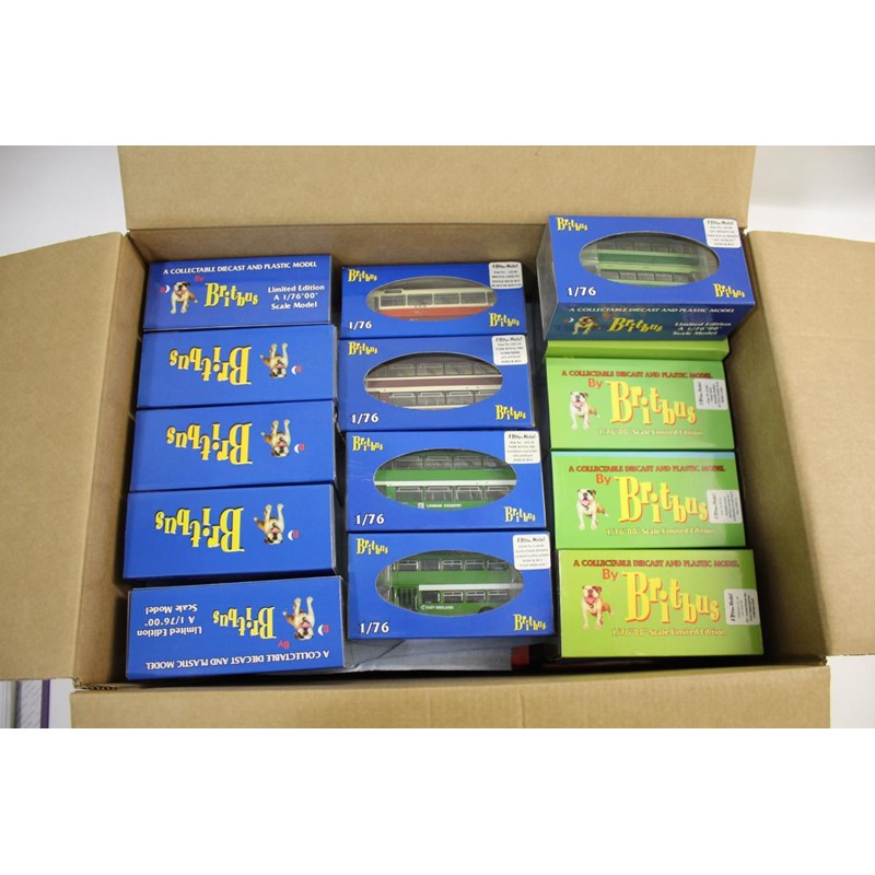 approx 53 boxed model buses in blue, red and green coloured boxes, including LH08 Bristol, ANI-14 Park Royal, ANI-28 London Country, LLB-09 East Midland, AE-04 AEC Regent, GL-05 Guy Arab, and many other models.