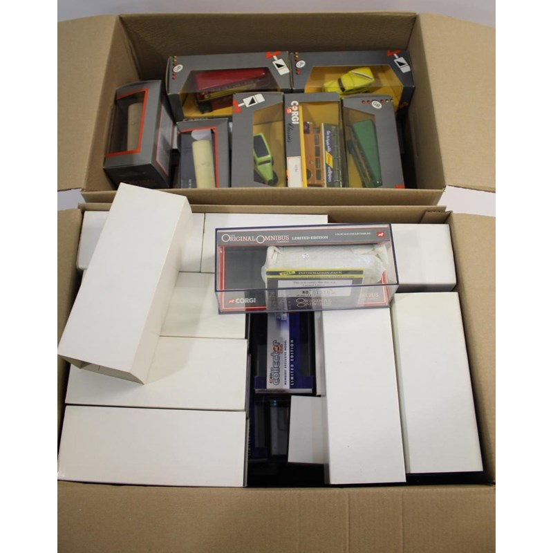 1 box including approx 34 boxed limited edition Corgi Omnibus buses, including 43705 Rotherham Transport (x3), 43708 Sunbeam South Lancs (x3), and many more. 2nd box with approx 24 boxed Corgi Classics and Corgi Original Omnibus models.