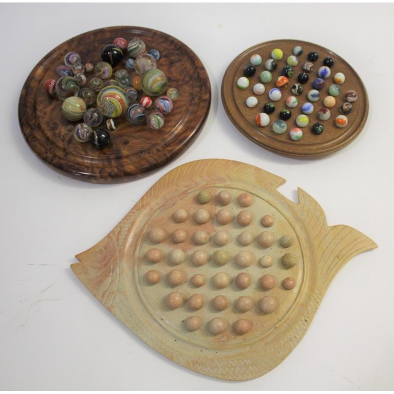 including a burr wood board with various hand blown and machine made marbles, including some latticino marbles, larger marbles etc. Also with a solitaire board with various coloured glass marbles, and a stone solitaire board in the form of a fish with matching marbles. (3)