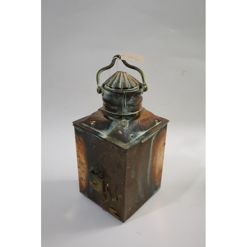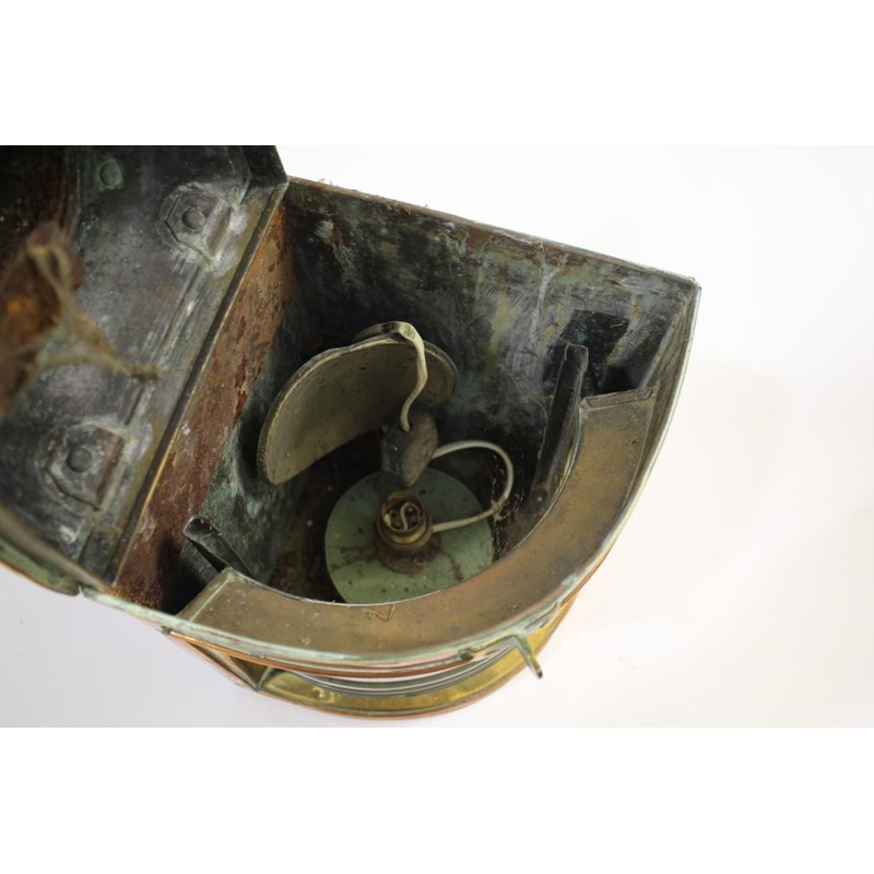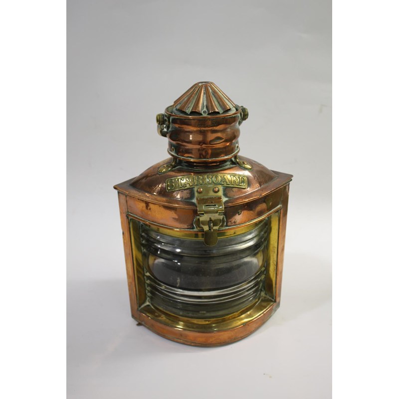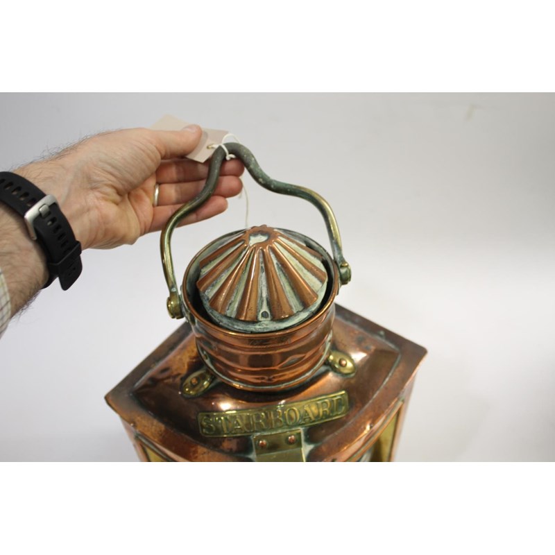 a copper and brass ships Starboard lantern with brass carrying handle. Stamped J E & H Player, Bingley Works, Birmingham. 40cms high (excluding handle)