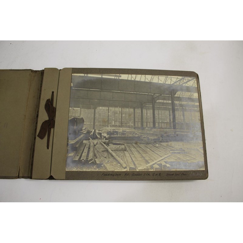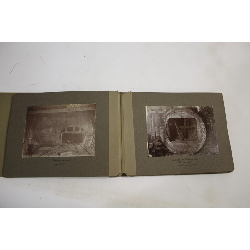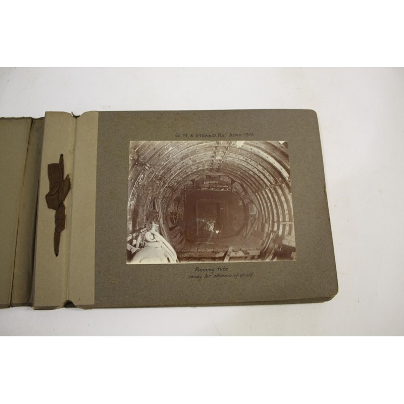 3 albums with various annotated photographs showing views of tube tunnels being constructed and other railway views with figures in some, including G N & Strand RY Running Tube 1904, Running tunnel rotary excavator, station tunnel head wall, railway to Harworth 1923, Ryton Viaduct, Farrington Rd Goods Station, bridges, etc. (3)