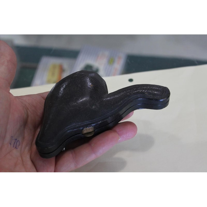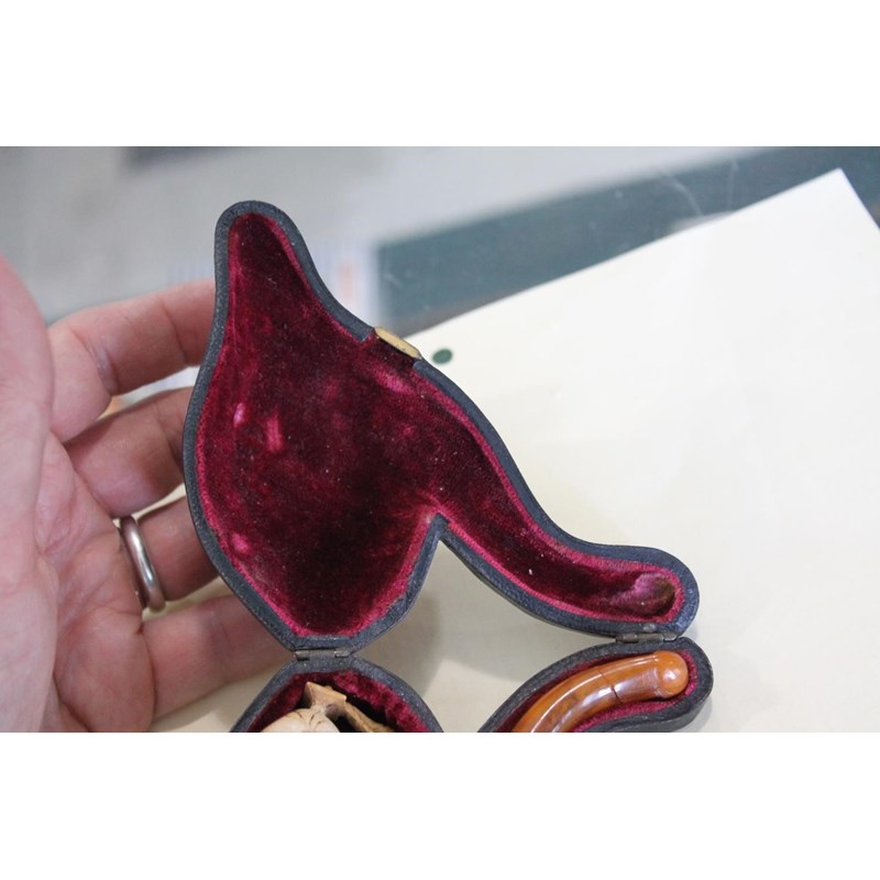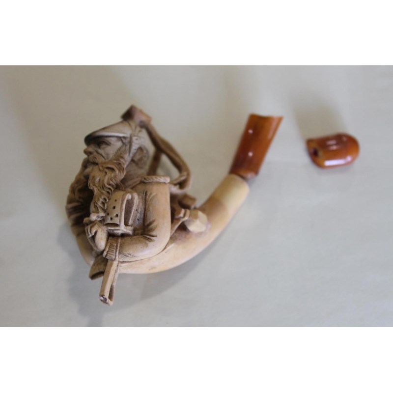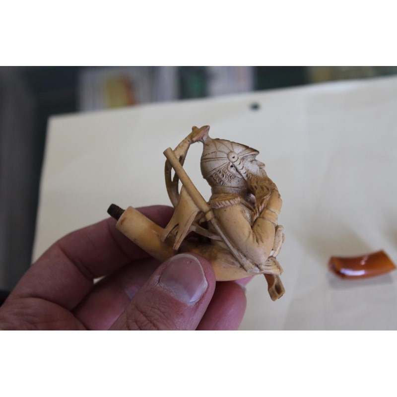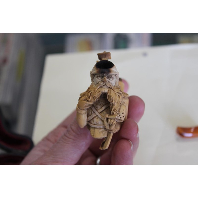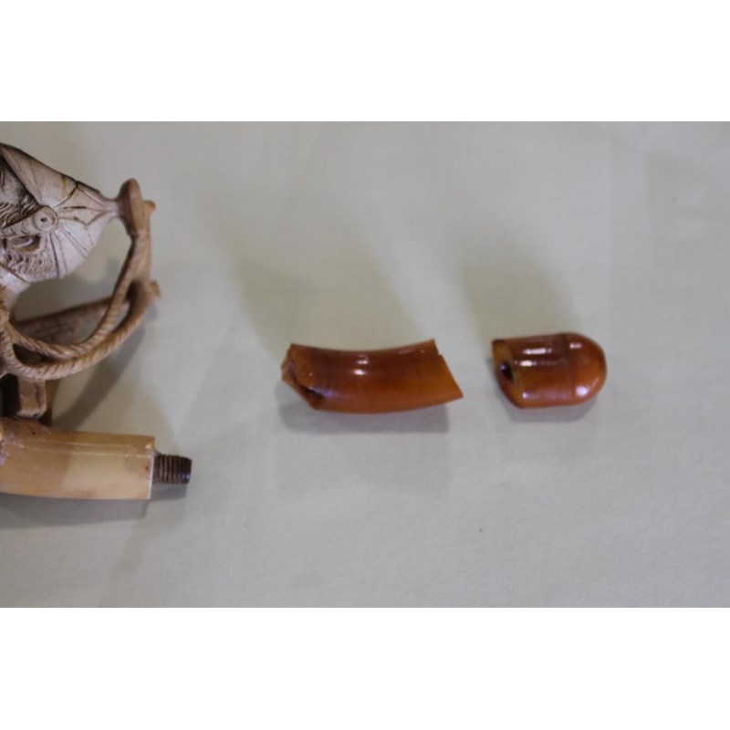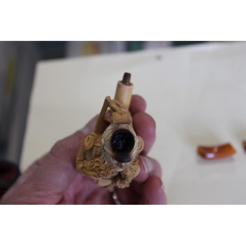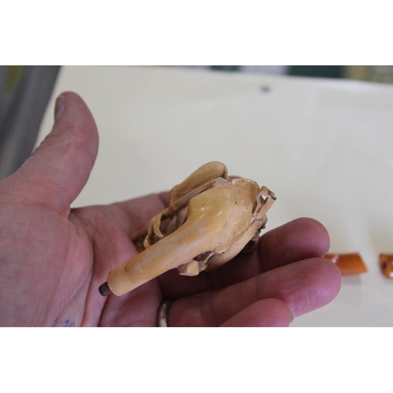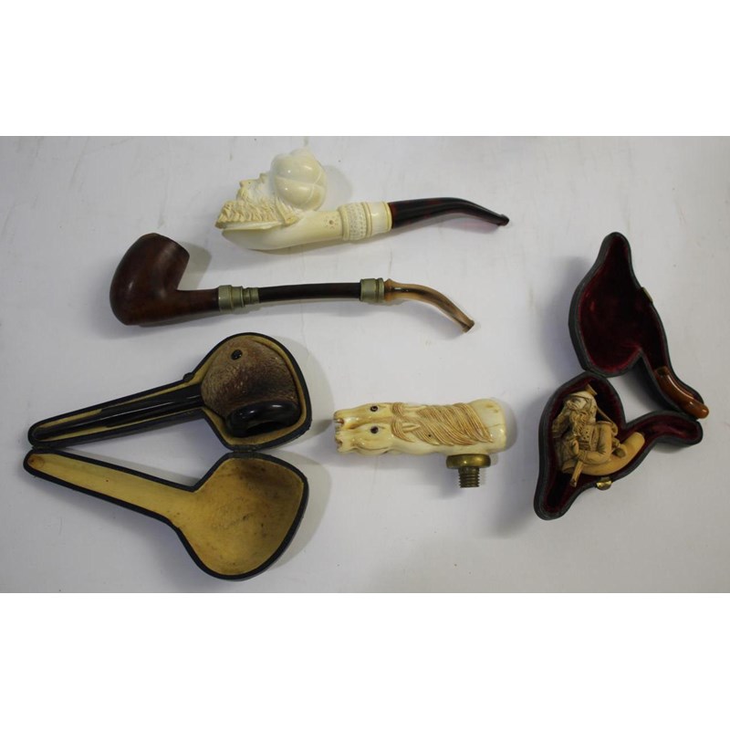 including a duck shaped pipe in a fitted leather case by Fribourg & Theyer, London, Oxford & Cambridge, a meersham carved pipe of a gentleman (handle broken) and 2 other pipes. Also with a carved ivory walking stick handle in the form of three horses.