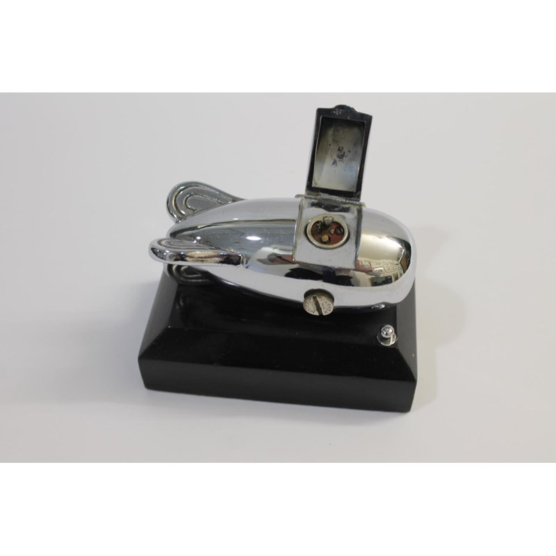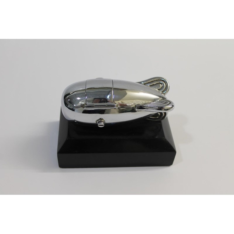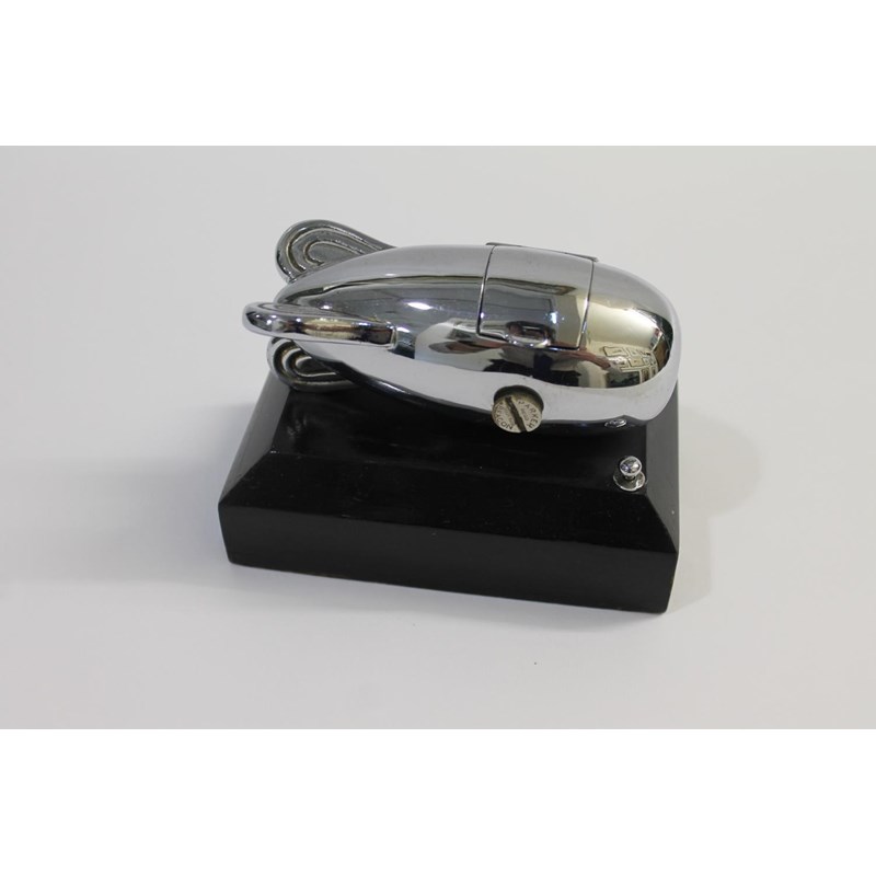 an unusual chrome plated table lighter in the form of a barrage balloon, mounted on a wooden base with chrome switch. Stamped Asprey London, Chrome Plated, and Parker Beacon, Regd. 11.5cms long, base 13cms long