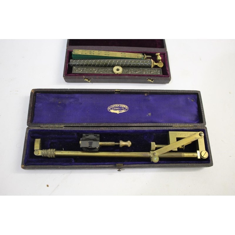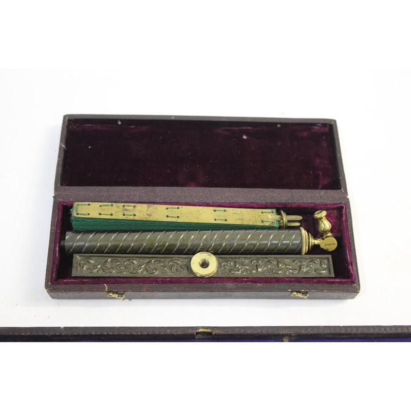 a brass instrument possibly an attachment for a microscope, in a fitted case by Negretti & Zambra. Also with a small 19thc brass table fan, in sections which can be assembled and in a fitted case. (2)