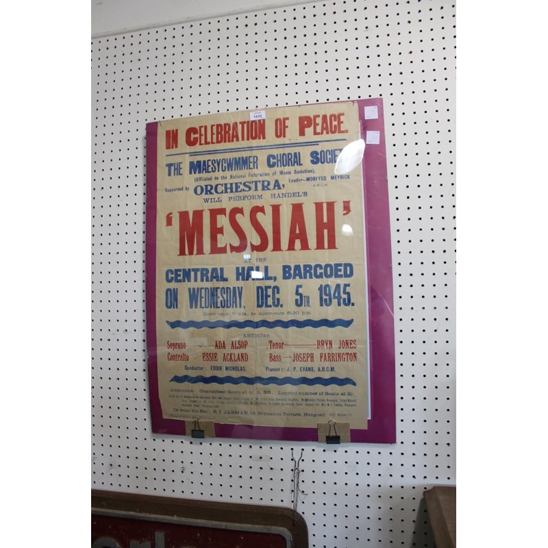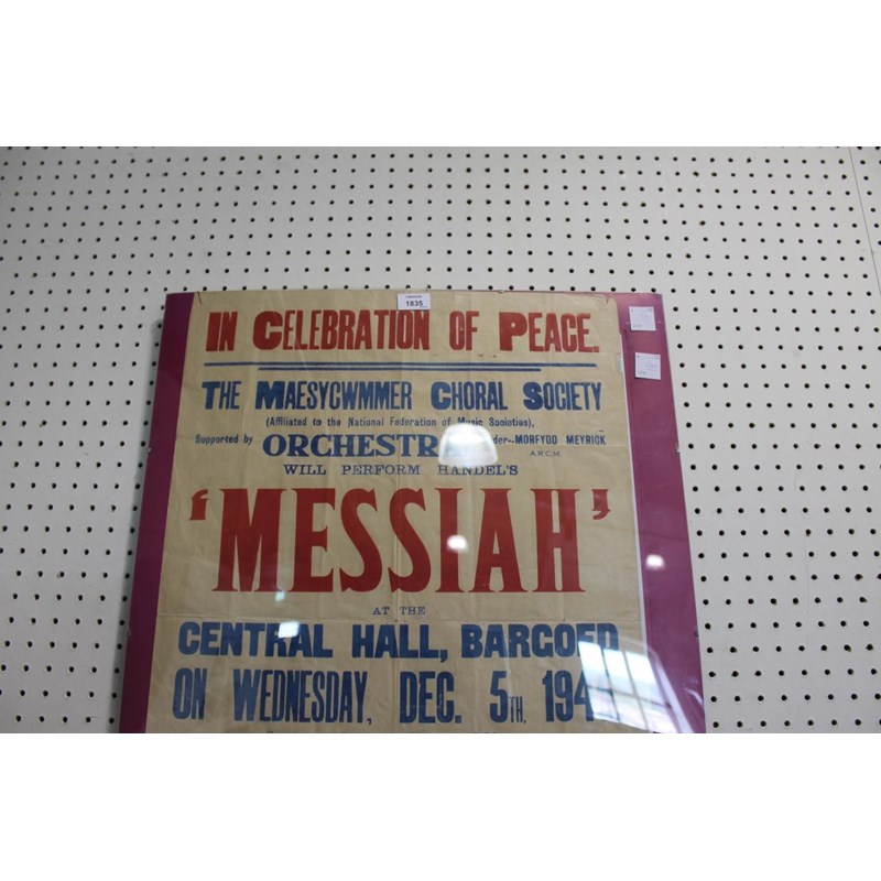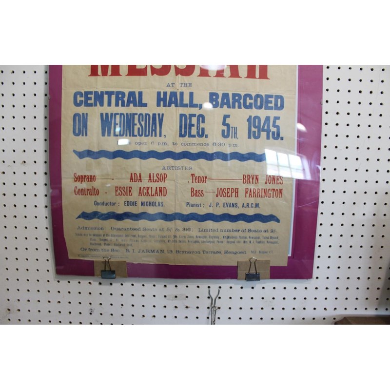 a vintage poster from 1945, The Maesycwmer Choral Society performing Messiah, held at the Central Hall, Bargoed, Wed Dec 5th 1945. 75cms by 51cms
