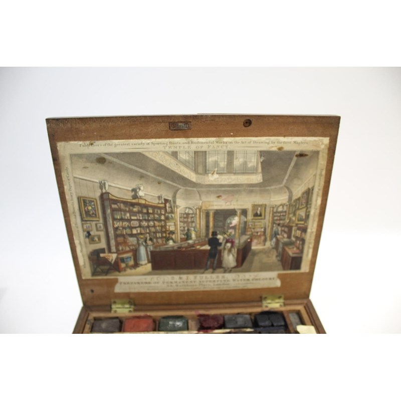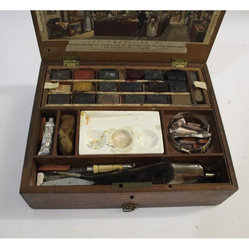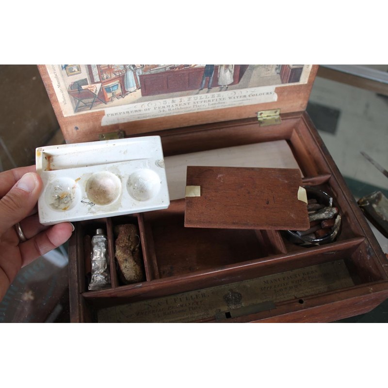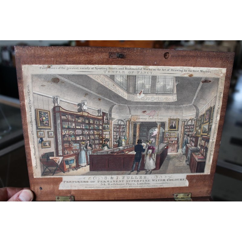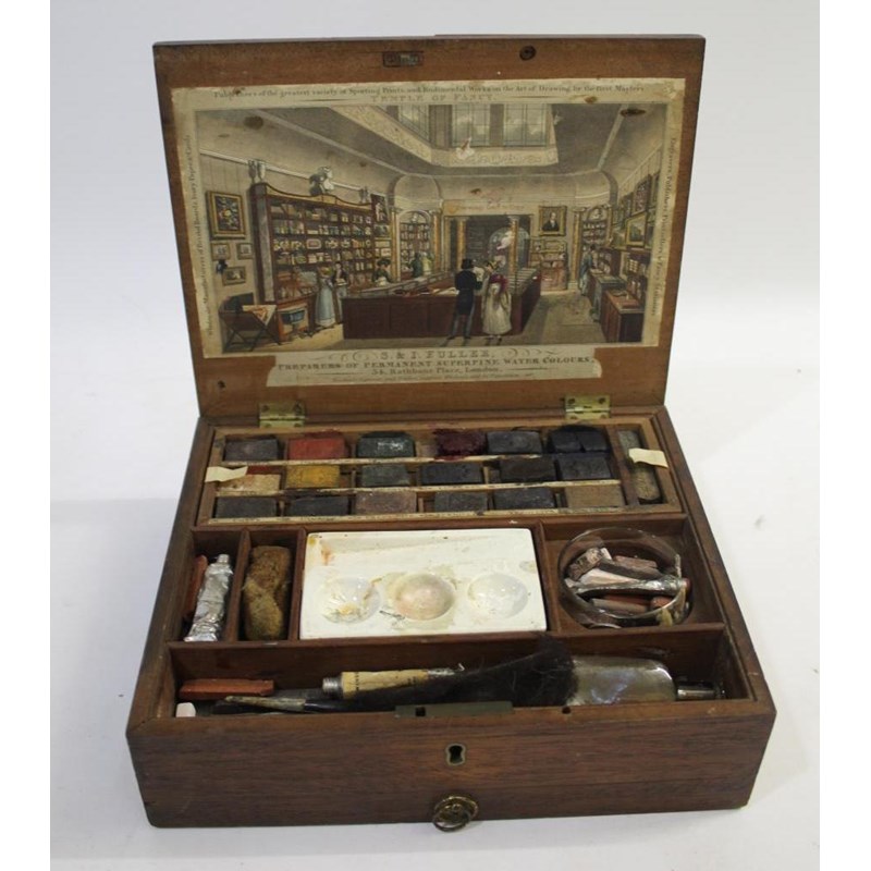 a mahogany paint box with fitted interior and single drawer, including original blocks of paint with labels underneath, mixing palette and various accessories. With labels inside for S & I Fuller, Preparers of permanent superfine Watercolours, 34 Rathbone Place, London. 24.5cms by 20cms