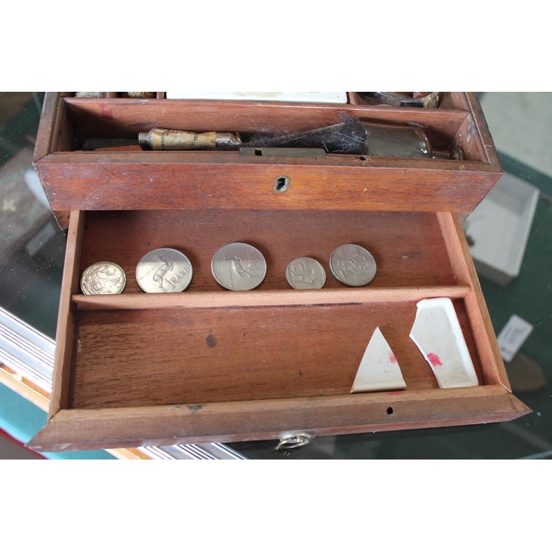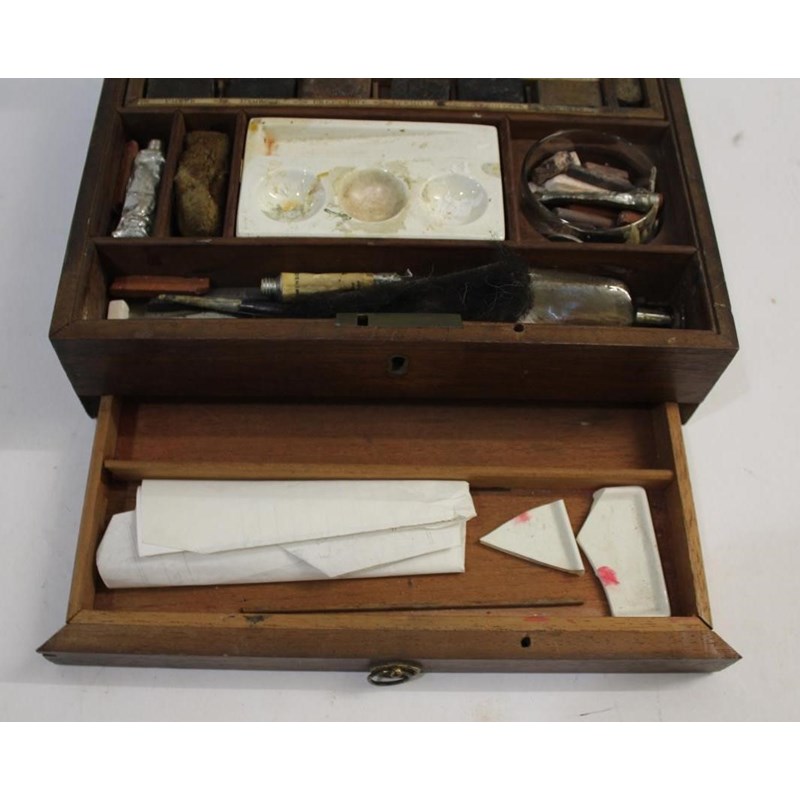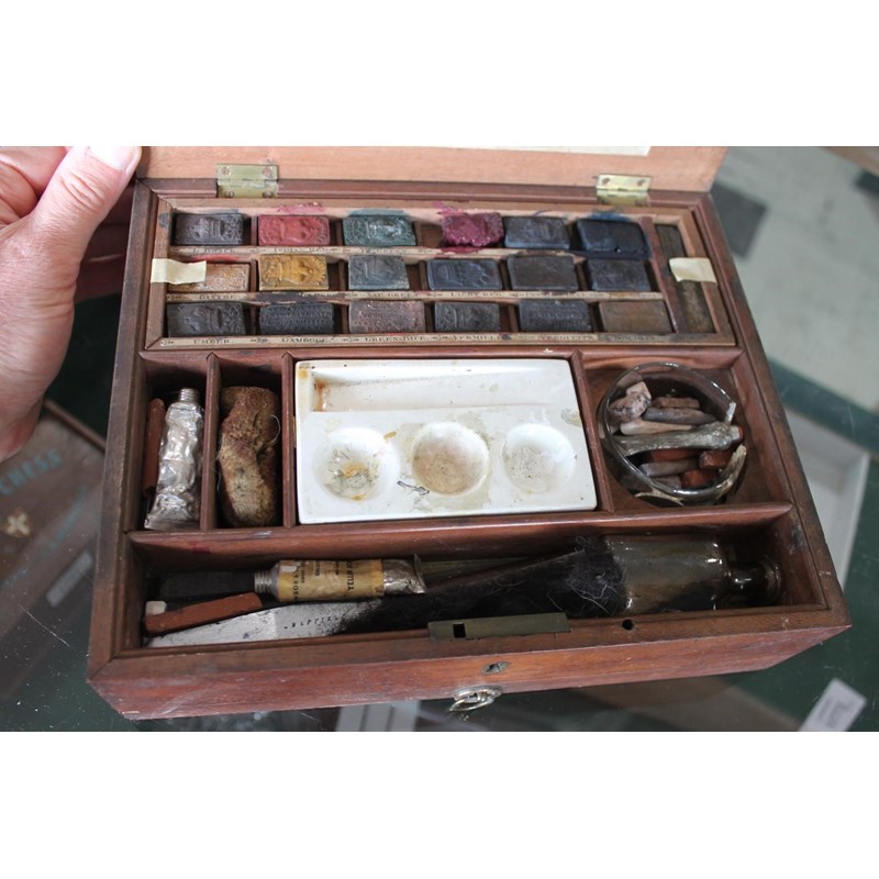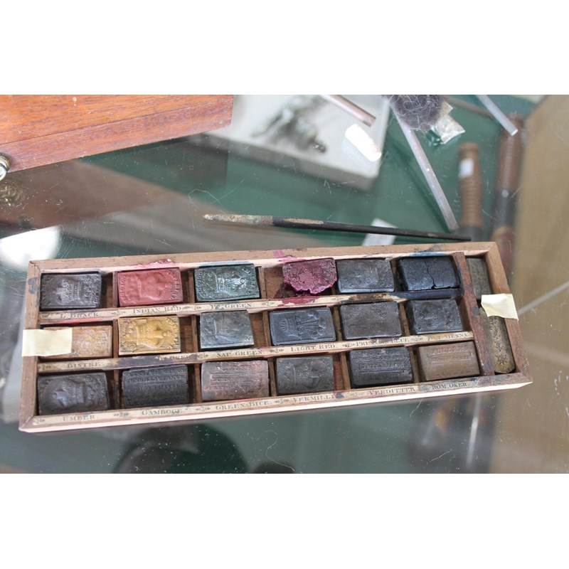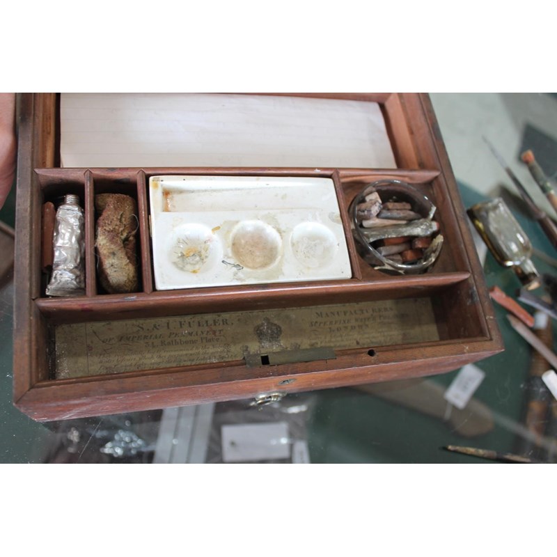 a mahogany paint box with fitted interior and single drawer, including original blocks of paint with labels underneath, mixing palette and various accessories. With labels inside for S & I Fuller, Preparers of permanent superfine Watercolours, 34 Rathbone Place, London. 24.5cms by 20cms