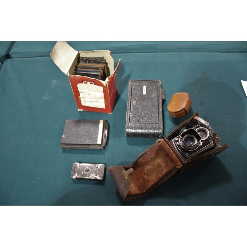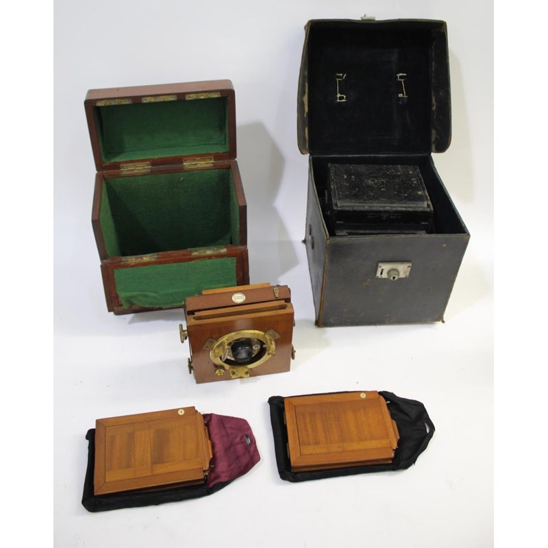 a mahogany cased plate camera by Bausch & Lomb, retailed by E & T Underwood and with a mahogany box and two plates. Also with a Special Ruby plate camera, a small Ensignette camera, Microcord cased camera, and accessories, and a 19thc field microscope (parts missing).