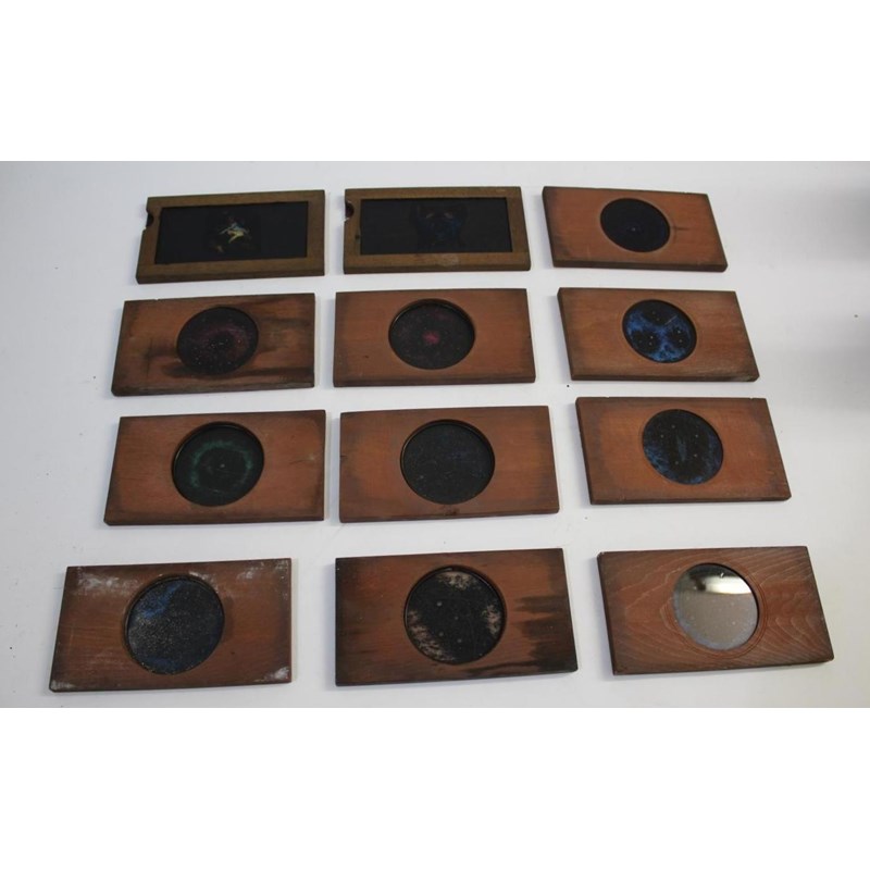 including 2 wooden framed slides with glass sliding images, also with 10 other wooden frame slides showing star constellations. Also with 3 large boxes with glass slides (China & Chinese, British and European buildings and landscapes) and some loose slides, boxed magic lantern and various accessories. Also with a boxed Kodatoy projector and reels.