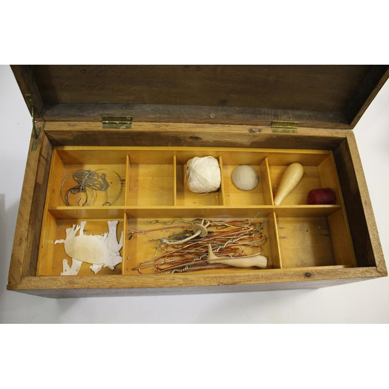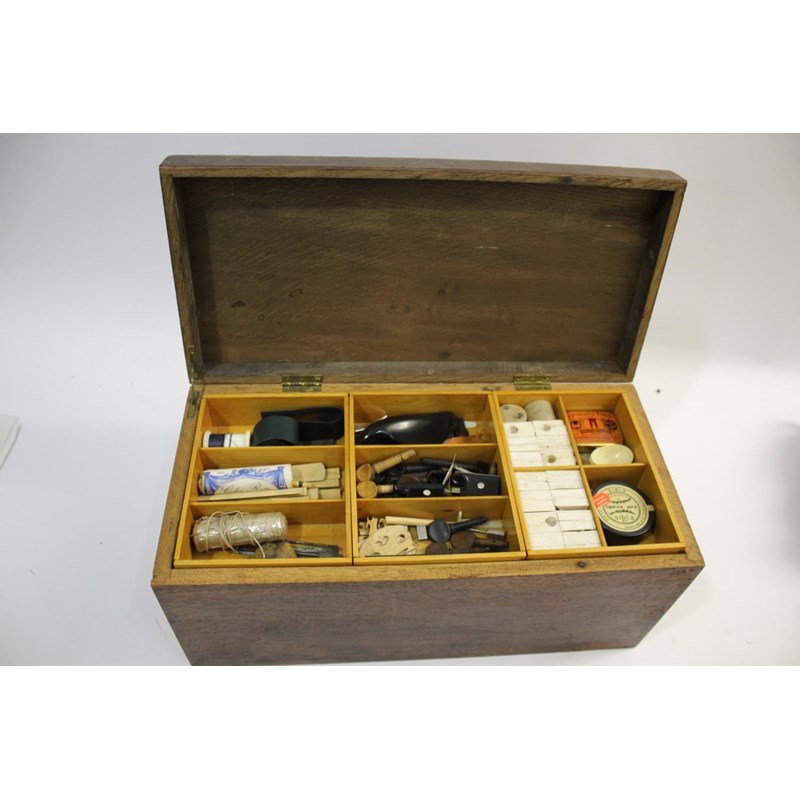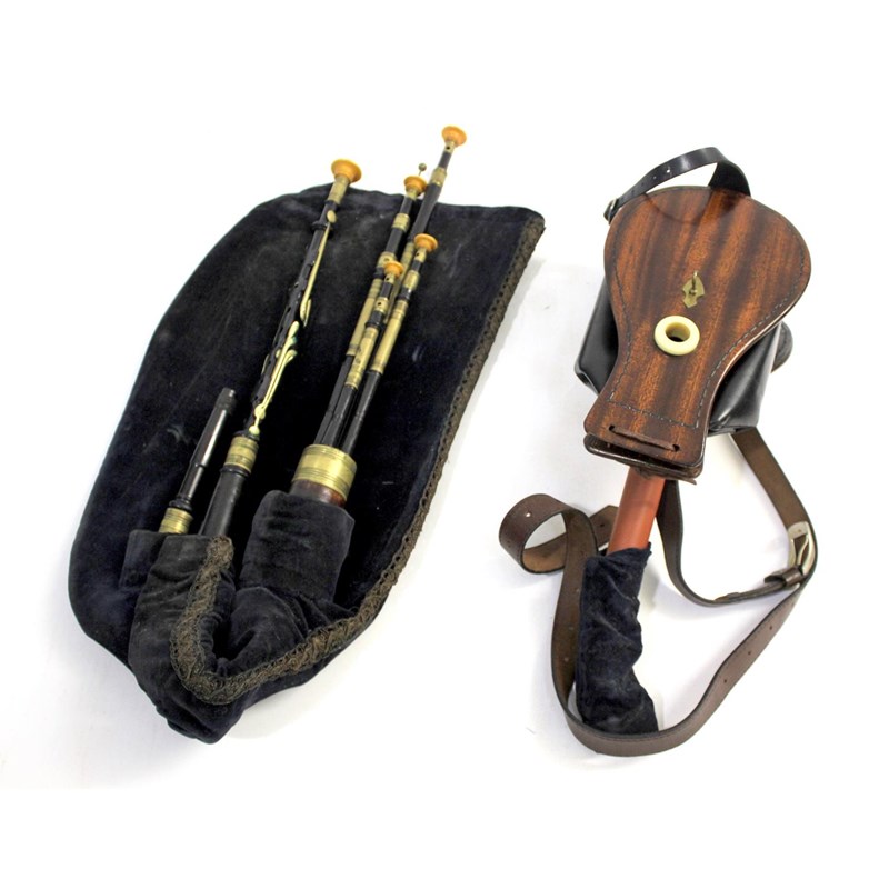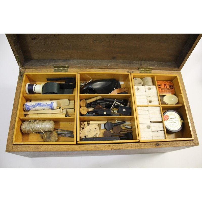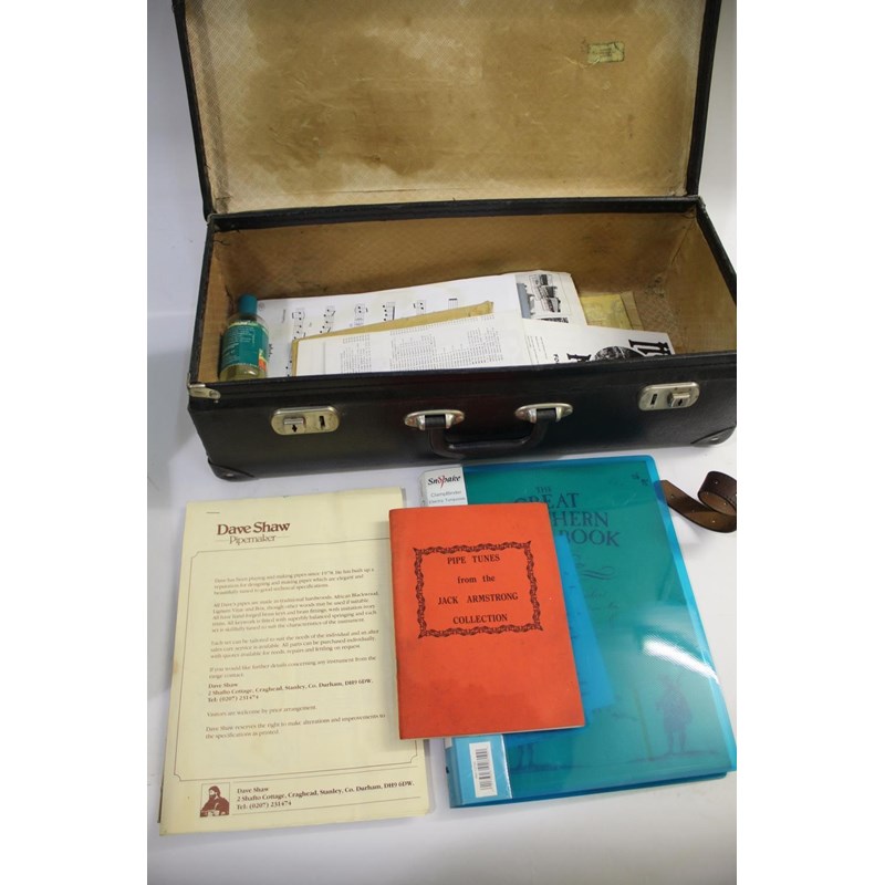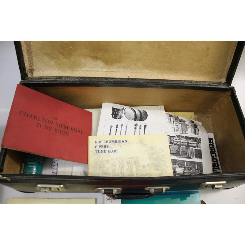 a set of 9 key Northumbrian pipes with wooden and metal sections and with a velvet covered bag, with a separate bellows section, in a case with pipe music books, sheet music etc. Also with a large box with instrument makers accessories, including reeds, ends of bows, pegs etc. The pipes stamped Burleigh, 381. (2)