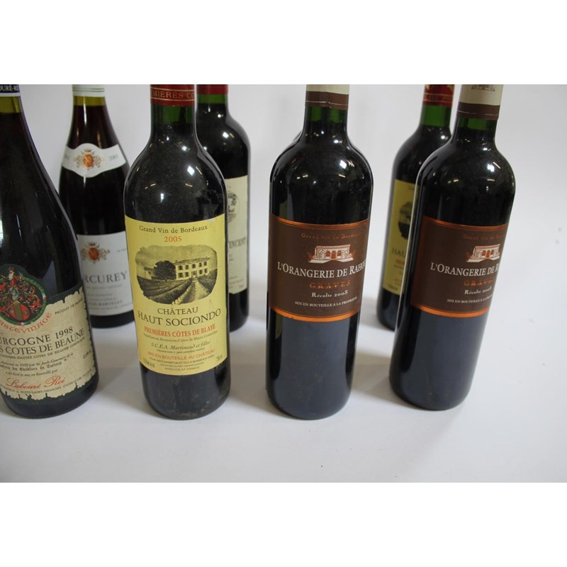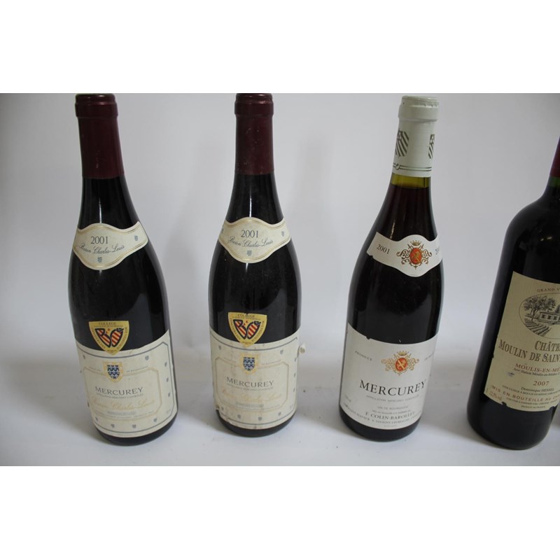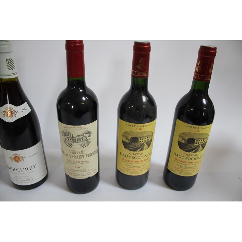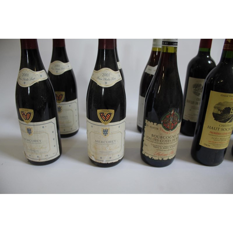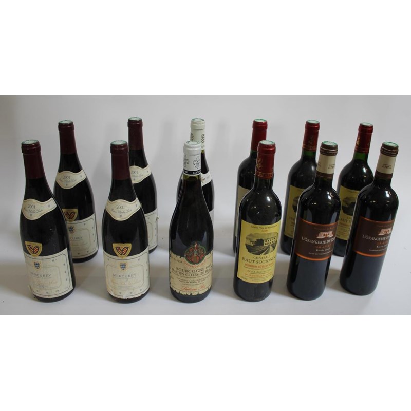 including 4 bottles of Baron Charles Louis Mercurey 2001, 1 bottle of Mercurey Vin de Bourgogne 2001, 1 bottle of Bourgogne Hautes Cotes de Beaune, 2 bottles of L'Orangerie de Rahoul 2008, 3 bottles of Chateau Haut Sociendo Premieres Cotes de Blaye 2005, and 1 bottle of Chateau Moulin De Saint Vincent, 2007. (12)