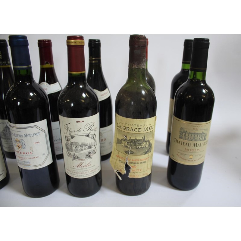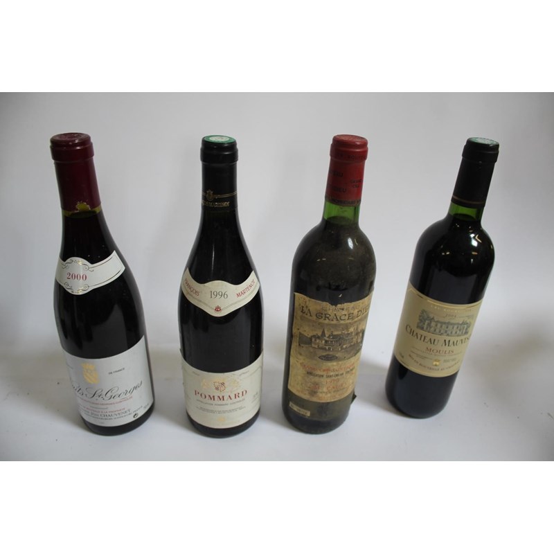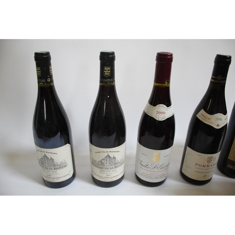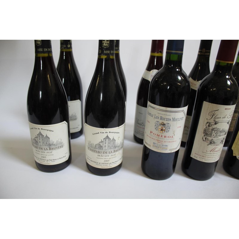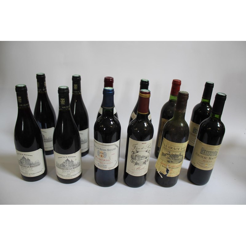 including 4 bottles of Chateau De La Bruyere Macon-Ige, 2005, 1 bottle of Pommard 1996, 1 bottle of Nuits St Georges 2000, 2 bottles of Chateau Mauvesin Moulis 2004, 2 bottles of Chateau La Grace Dieu (1979 and 1982), 1 bottle of Pomerol 1996, and 1 bottle of Fleur de Roche Moulis 2010. (12)
