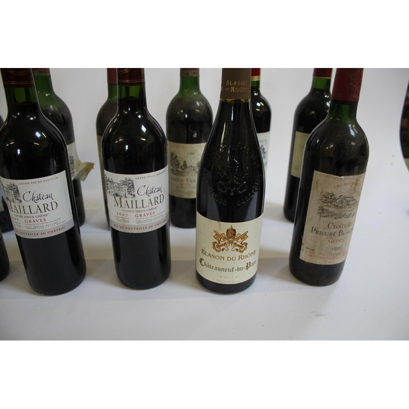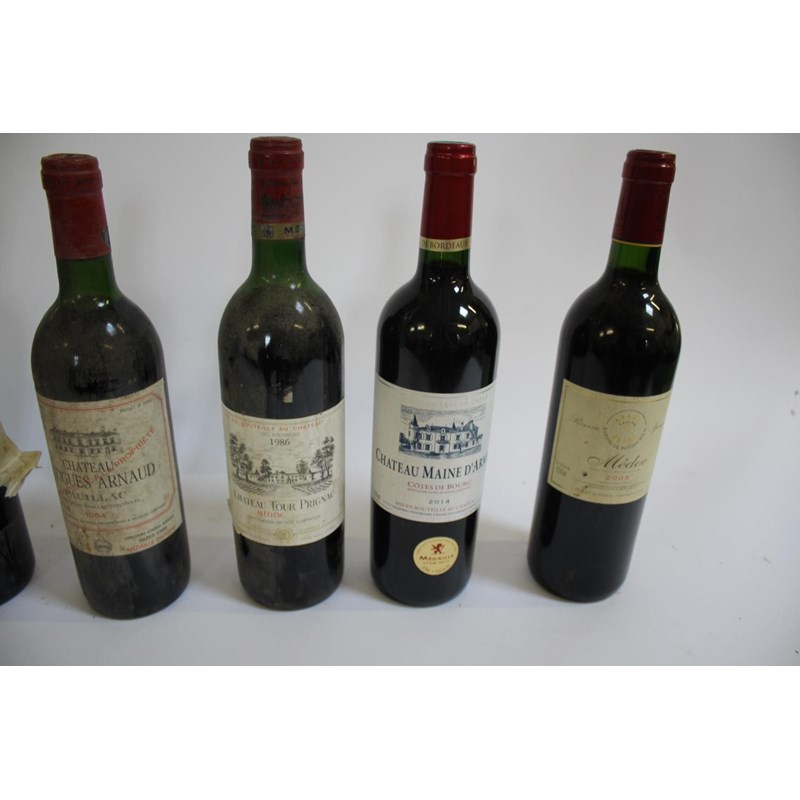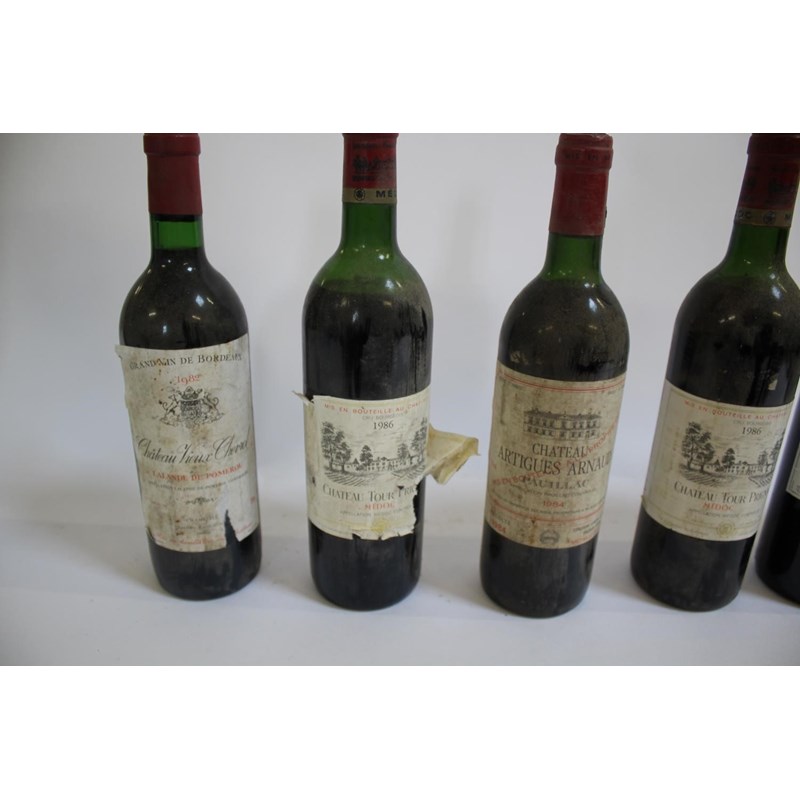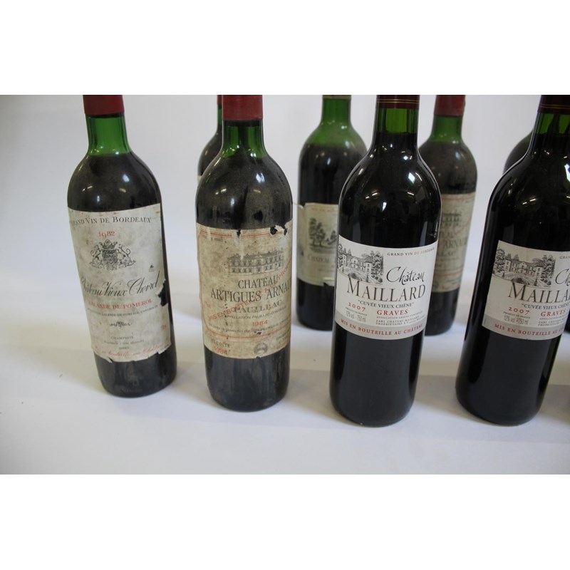 including 2 bottles of Chateau Vieux Lalande de Pomerol 1982, 2 bottles of Chateau Artigues Arnaud 1984, 2 bottles of Chateau Tour Prignac Medoc 1986, 2 bottles of Chateau Maillard Graves 2007, 1 bottle of Chateau Prieure Blaignan 1985, 1 bottle of Blason du Rhone Chateaueuf du Pape 2017, and 2 other bottles of wine. (12)