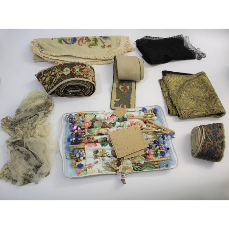 a mixed lot including various wooden lace bobbins, a panel of gold coloured embroidery onto a black wool background, a length of woolwork, a roll of woven trimming and similar textiles.