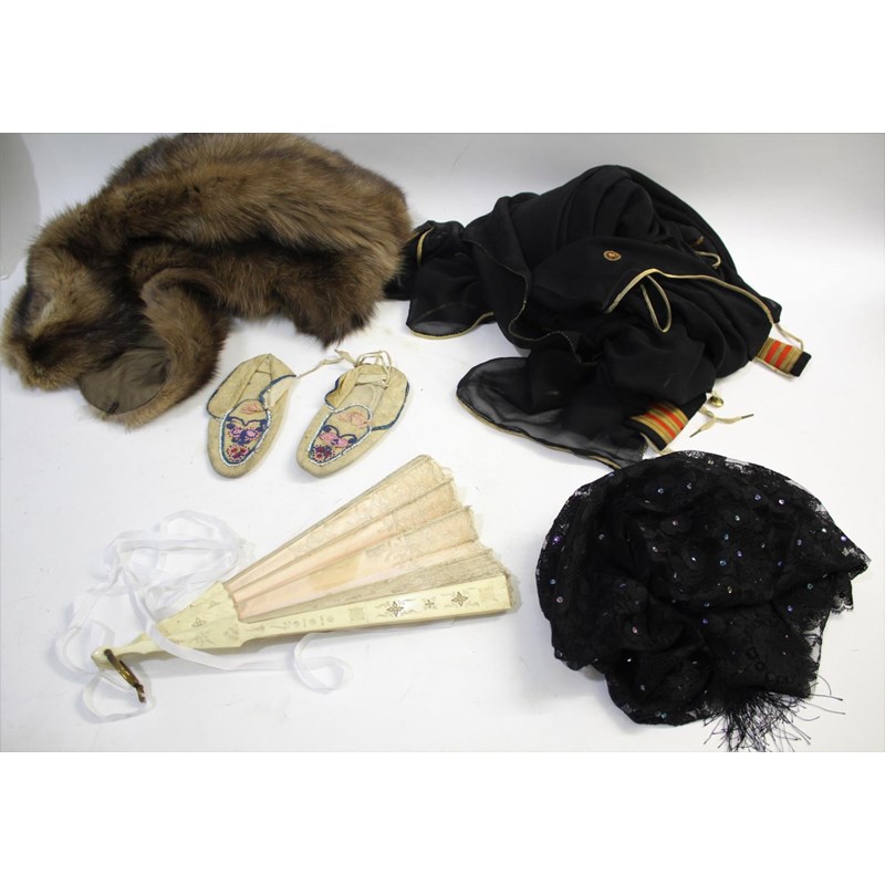 a mixed lot including a pair of cream leather child size Indian moccasins with bead decoration, a pale pink silk fan with applique lace decoration, a black lace shawl, a length of black chiffon sari fabric, fur cape and epaulettes (Medical Corps).