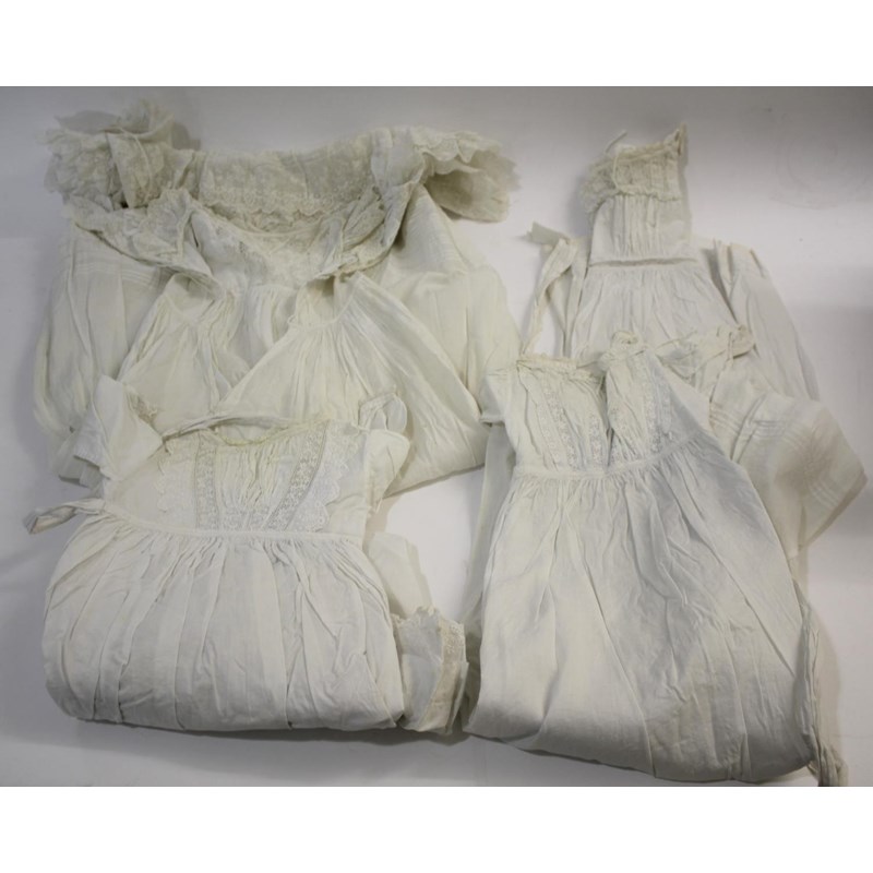 including a qty of late 19thc Christening gowns and petticoats, a cream fringed silk shawl, a lace trimmed night dress, and a collection of early to mid 20thc dresses for a small child.