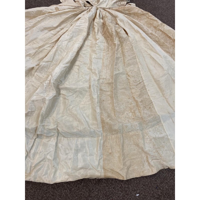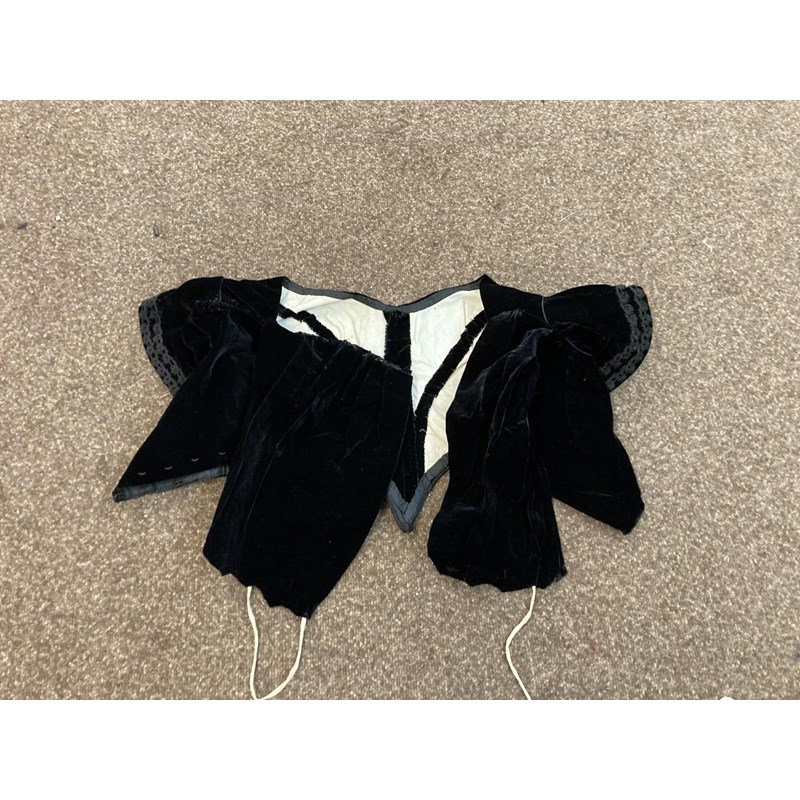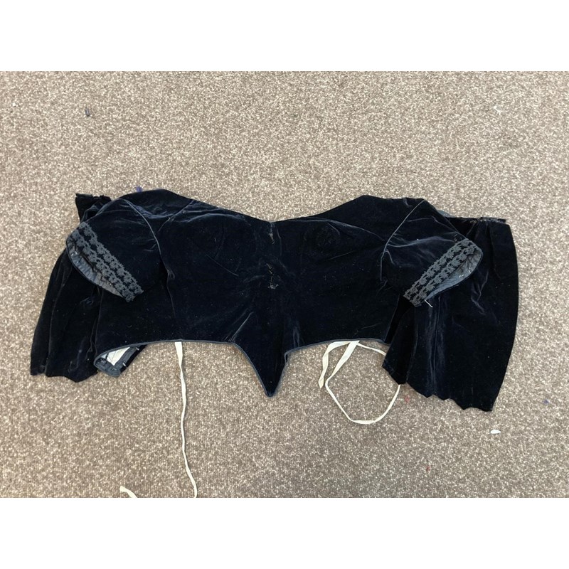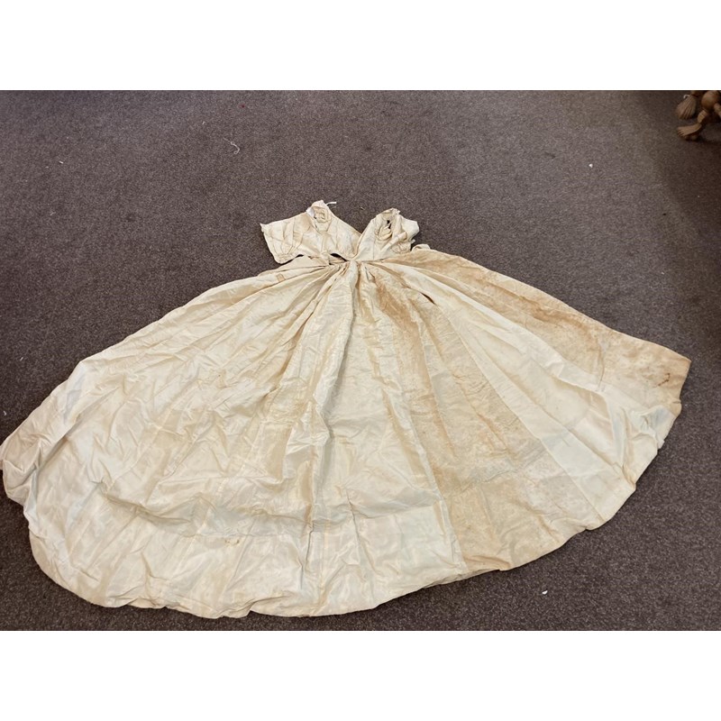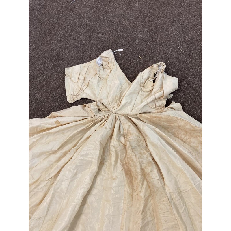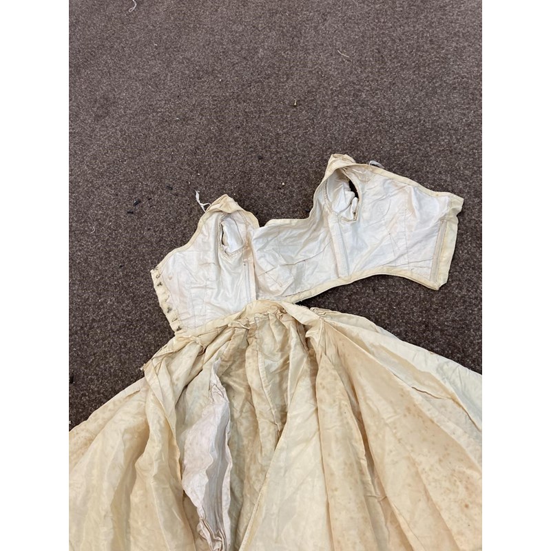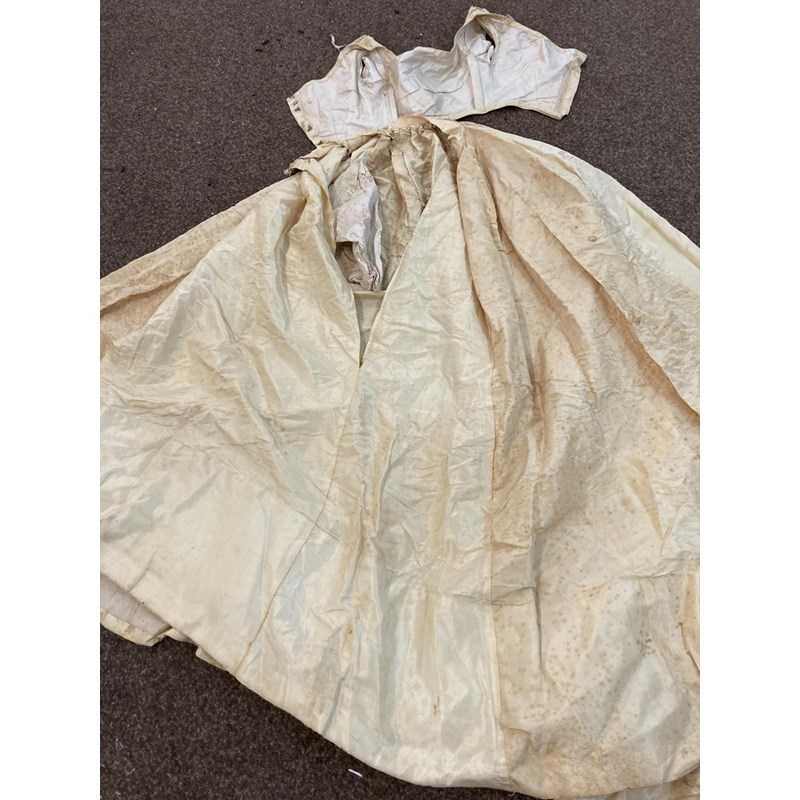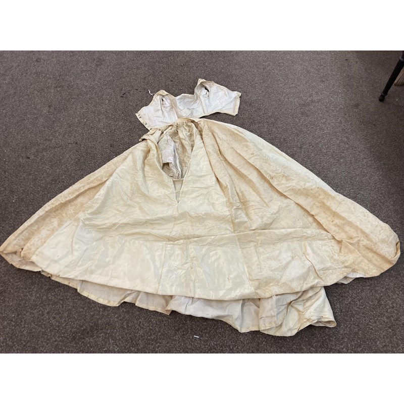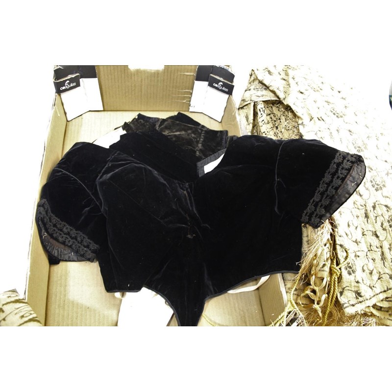 19THC SILK DRESS & TEXTILES a 19thc yellow silk dress, also with a black silk velvet bodice, and a qty of woven black and beige textiles.