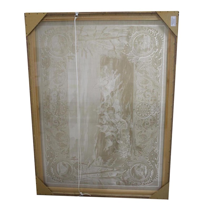 a large Irish linen panel with a winter landscape scene with central figures in a sleigh being attacked by wolves. In each corner is an image of a small house (Dacha), in a modern double sided perspex frame. Possibly made for the Great Exhibition, 128cms by 95cms (excluding frame)