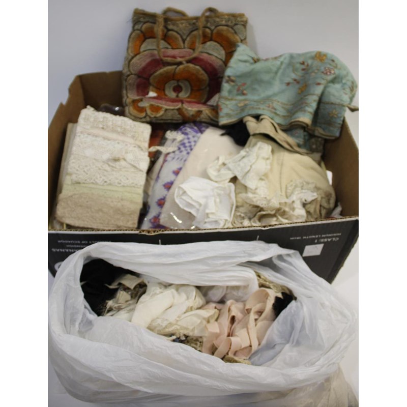 COLLECTION OF FABRICS & LACE a mixed lot including various fabric off cuts, household linens, a crewel work bag, and a qty of trimmings, lace scraps and similar items.