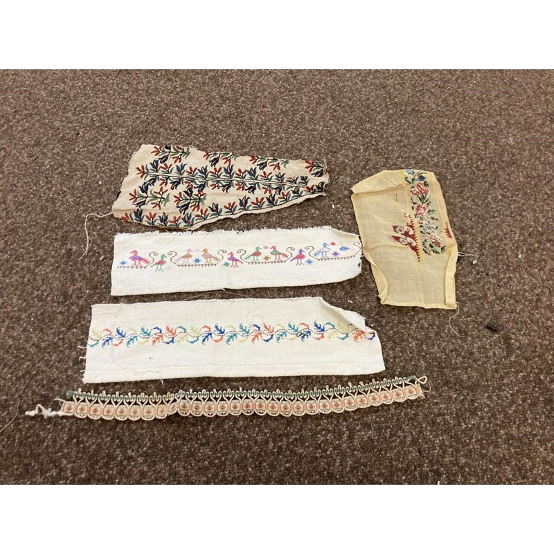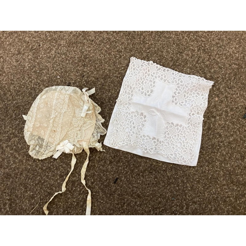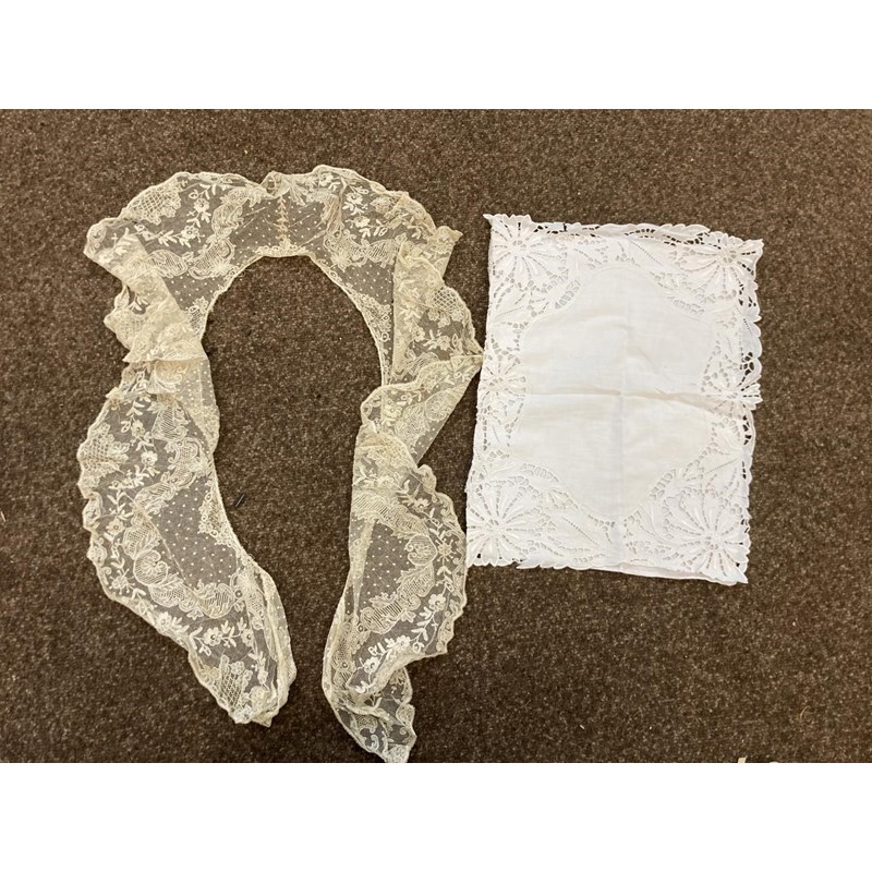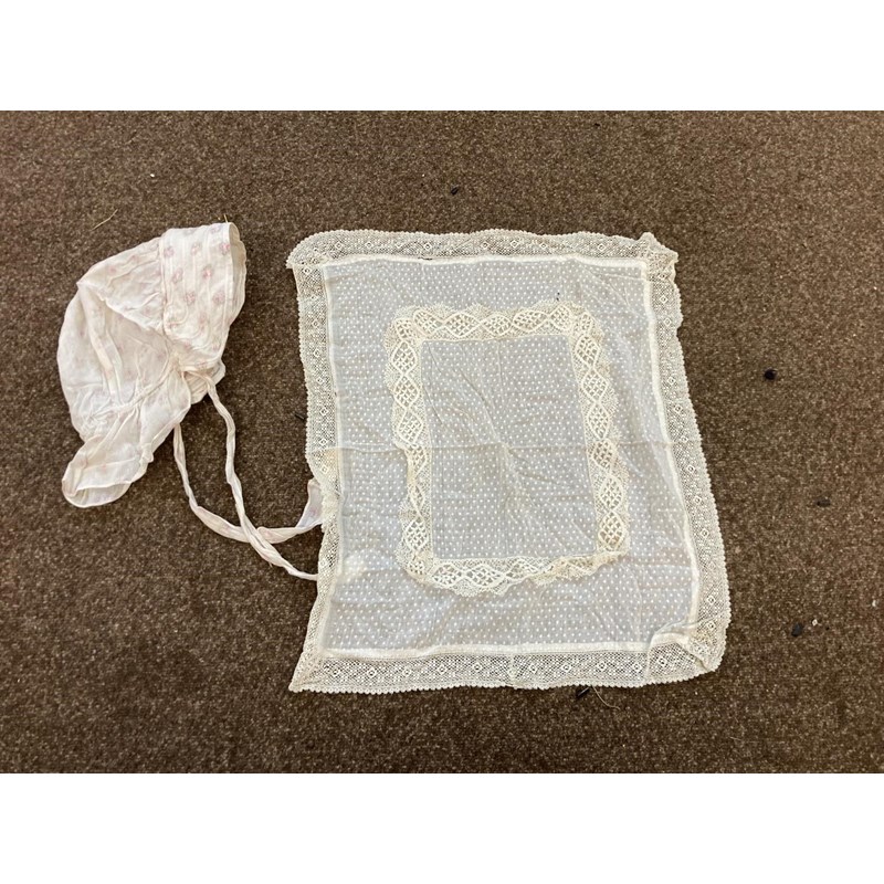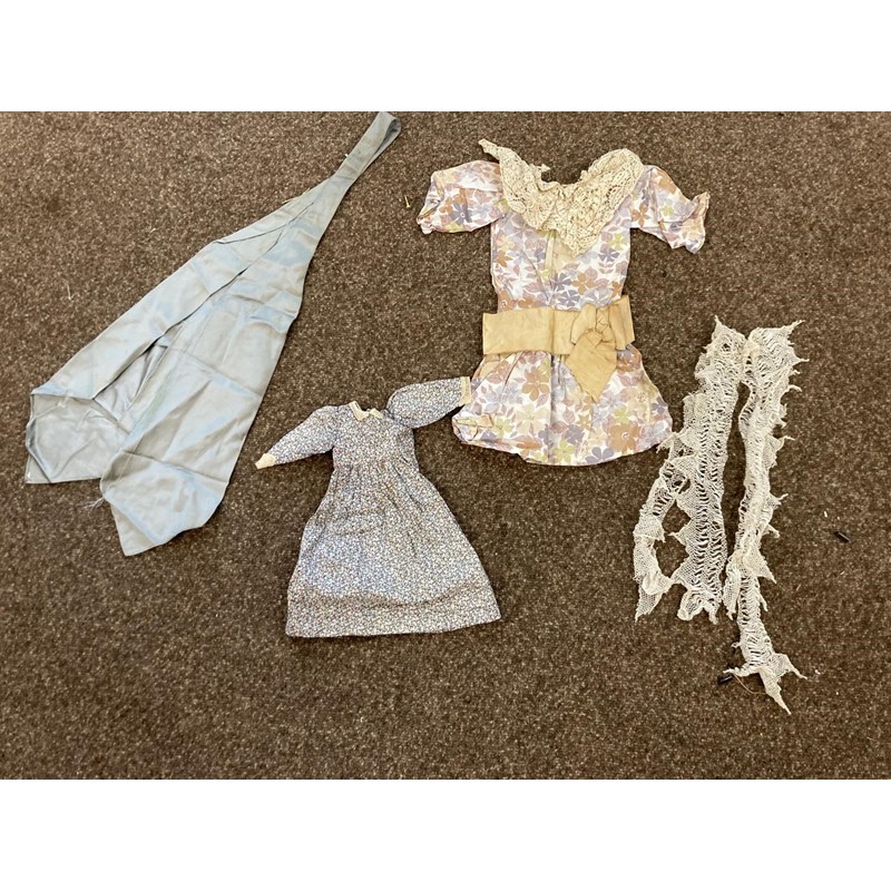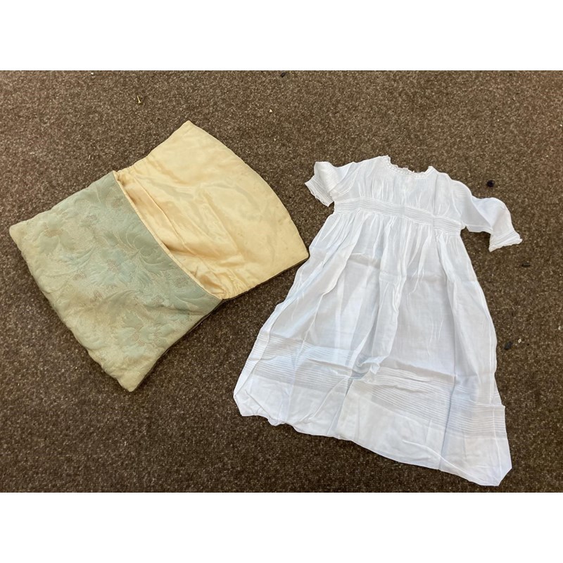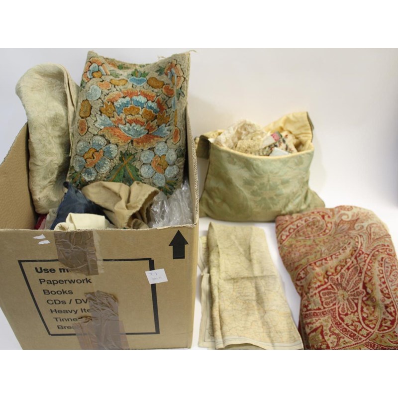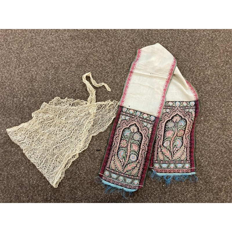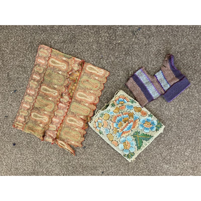 a mixed lot including a woven wool paisley shawl, a WWII silk escape map, an unfinished crewelwork bag, a cream silk velvet with applique decoration, a 1920's lace dress, and a qty of lace, dolls clothes and similar textiles.