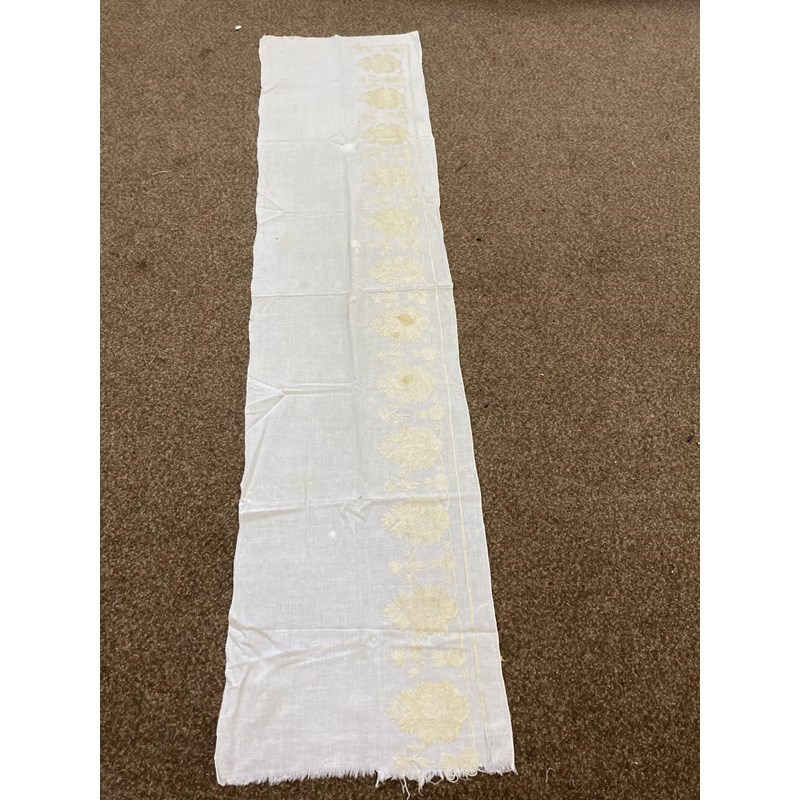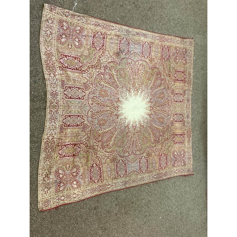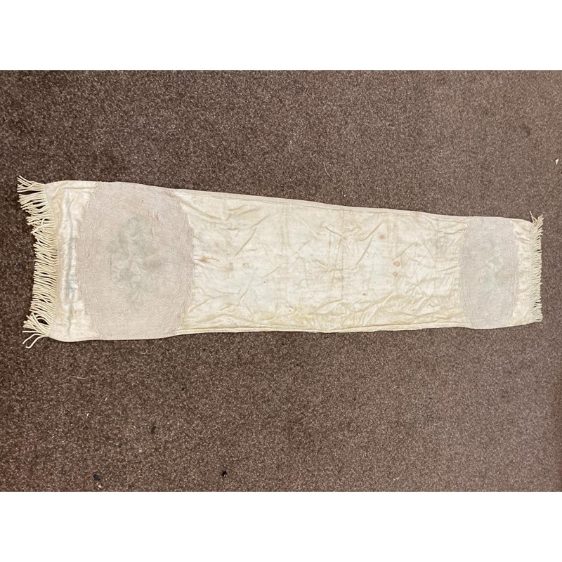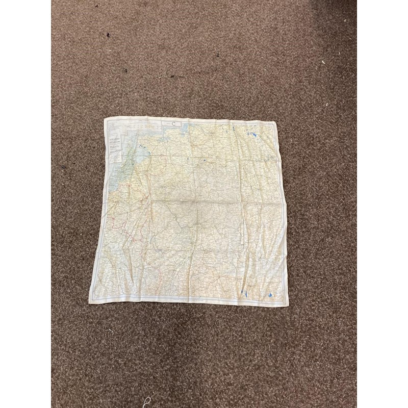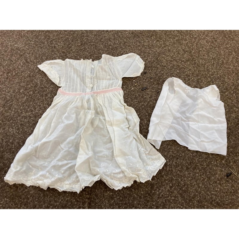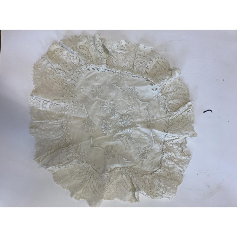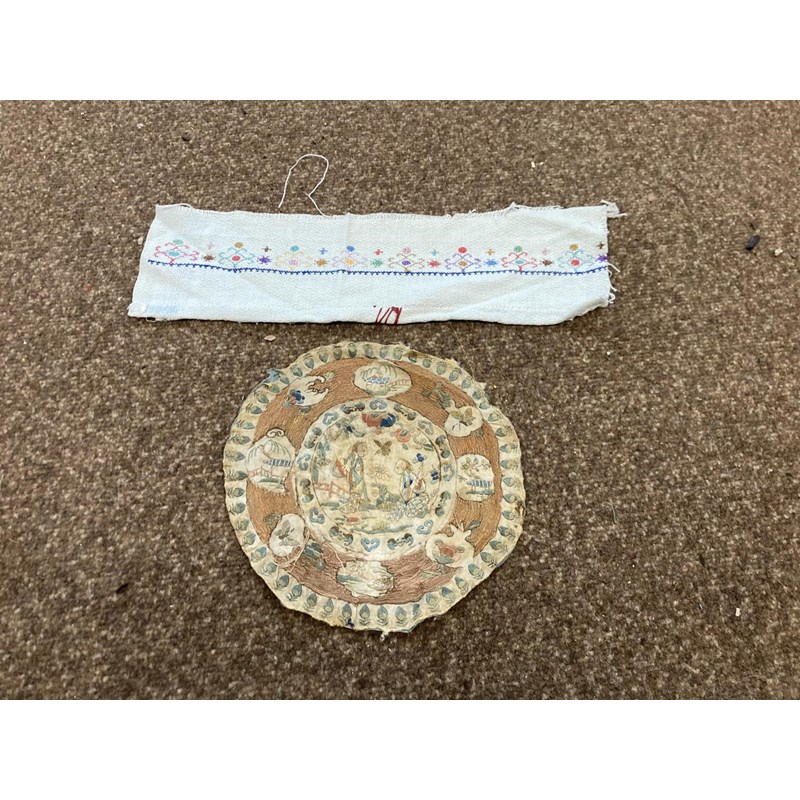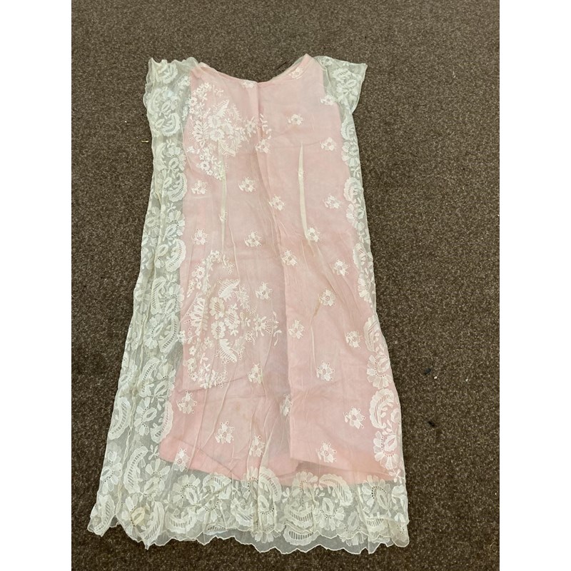 a mixed lot including a woven wool paisley shawl, a WWII silk escape map, an unfinished crewelwork bag, a cream silk velvet with applique decoration, a 1920's lace dress, and a qty of lace, dolls clothes and similar textiles.
