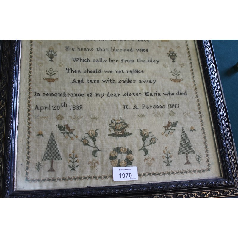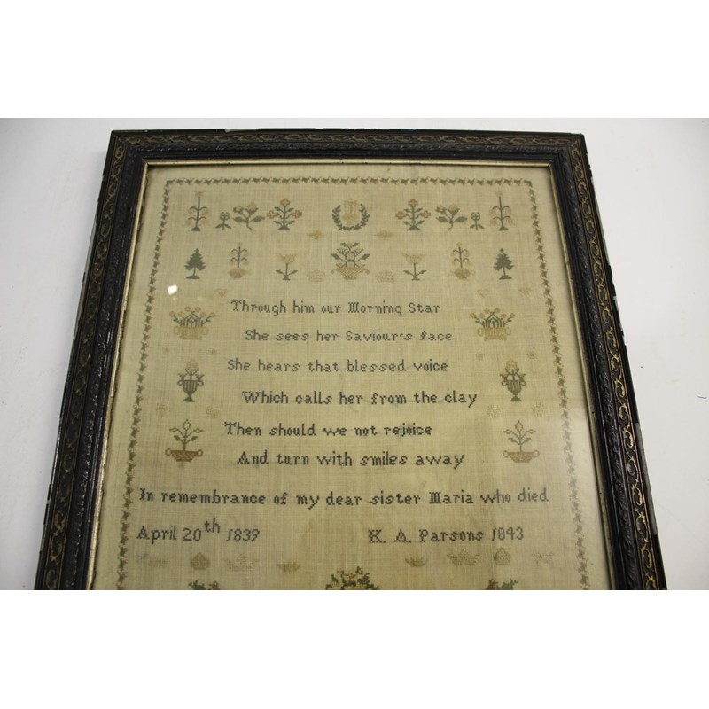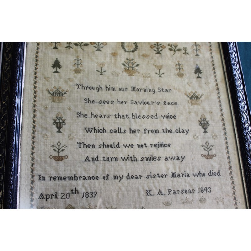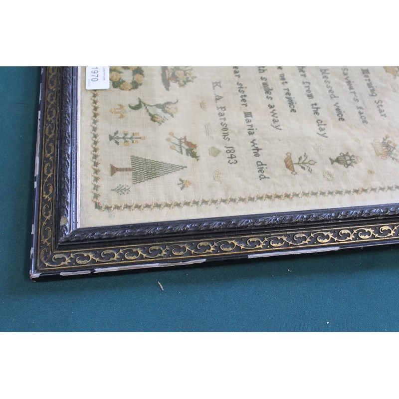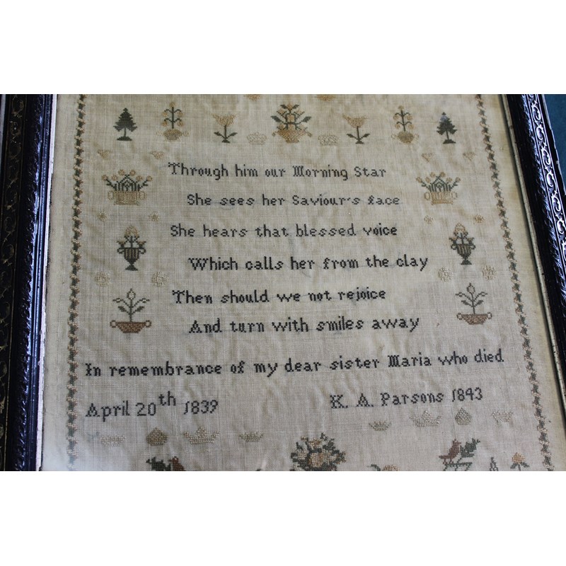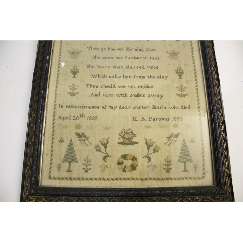 a sampler embroidered with a religious verse and also In remembrance of my dear sister Maria who died April 20th 1839, K A Parsons 1843. Also embroidered with trees and flowers and in an ebonised and gilded frame (probably the original frame). Sampler 41cms by 32cms