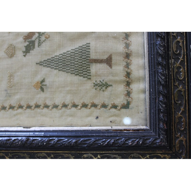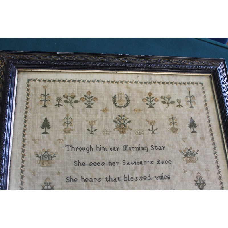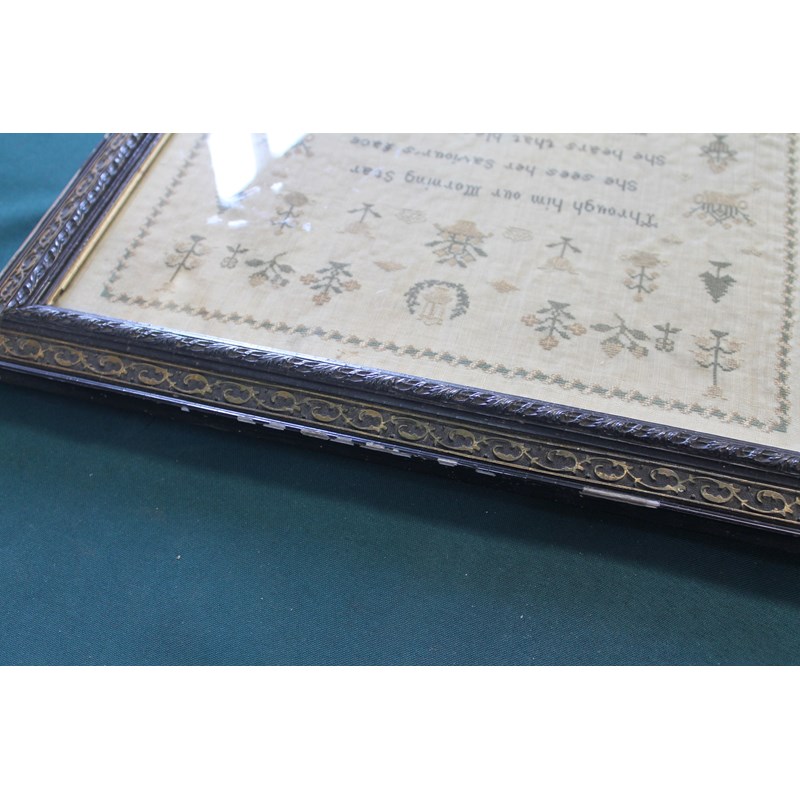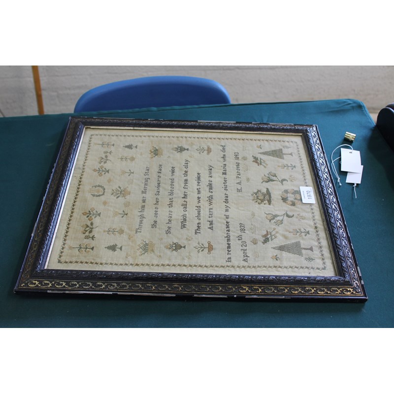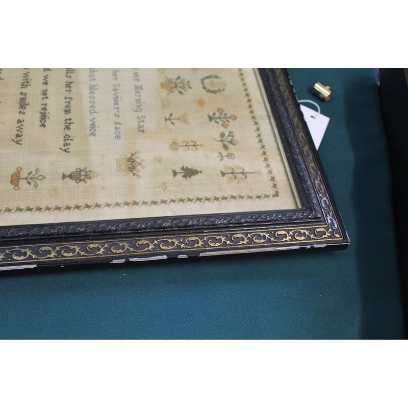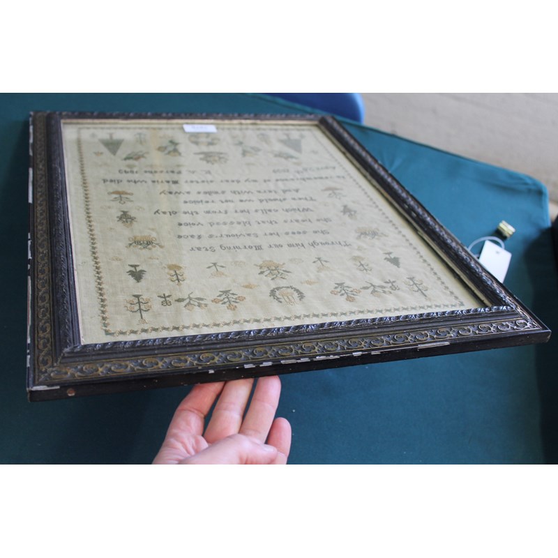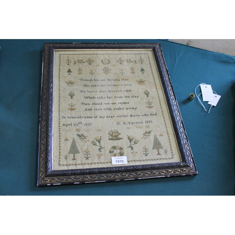 a sampler embroidered with a religious verse and also In remembrance of my dear sister Maria who died April 20th 1839, K A Parsons 1843. Also embroidered with trees and flowers and in an ebonised and gilded frame (probably the original frame). Sampler 41cms by 32cms