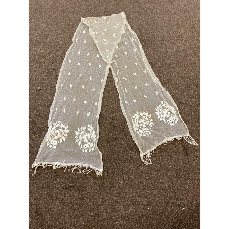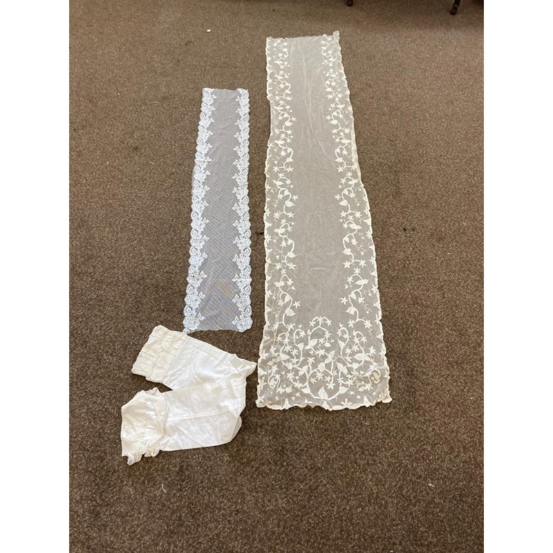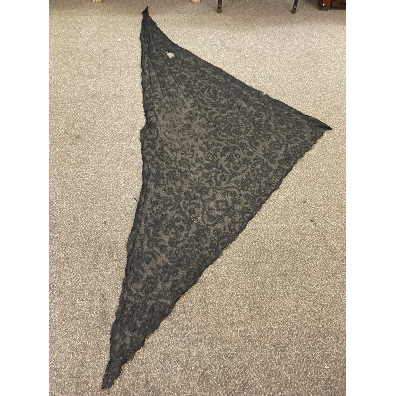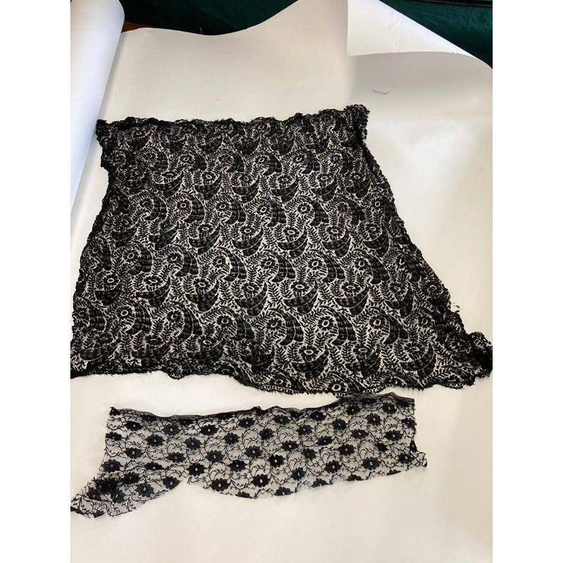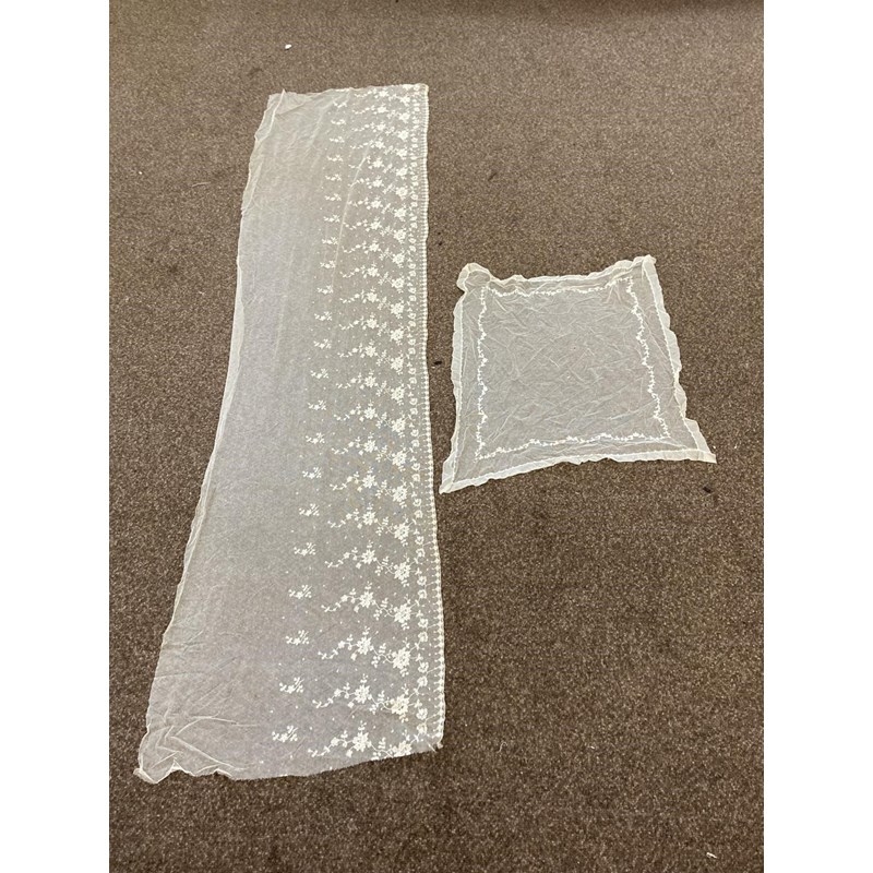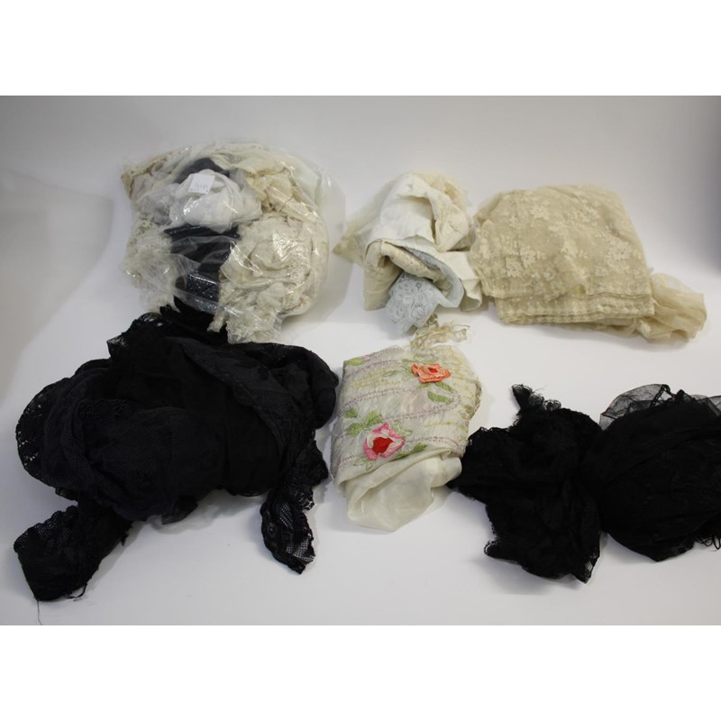 SILK SHAWL & TEXTILES a fine silk shawl embellished with ribbon design flowers, a black lace shawl, and a qty of net and lace edgings and off cuts.