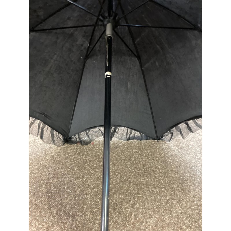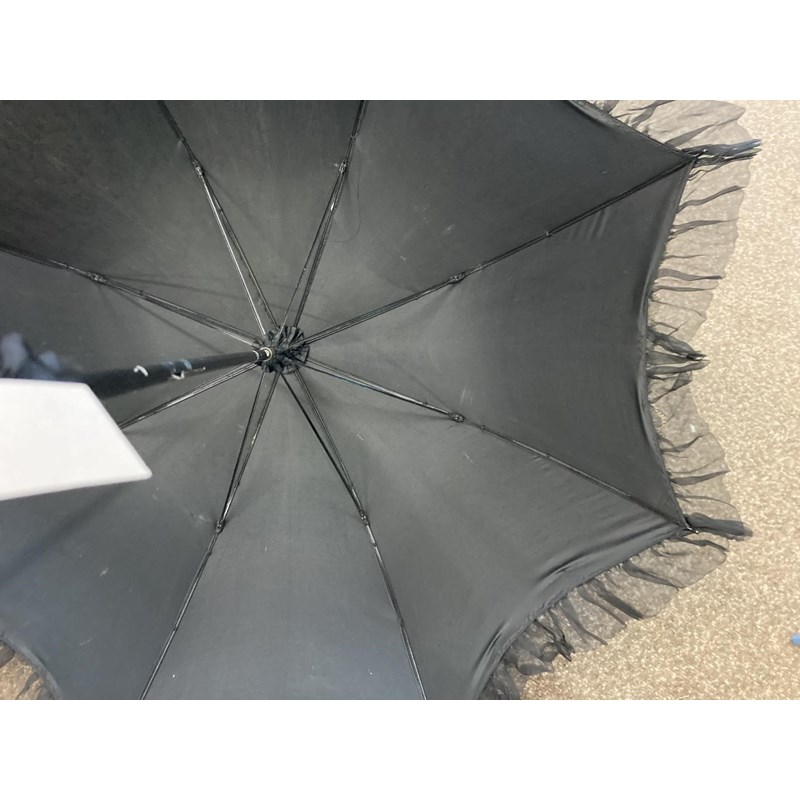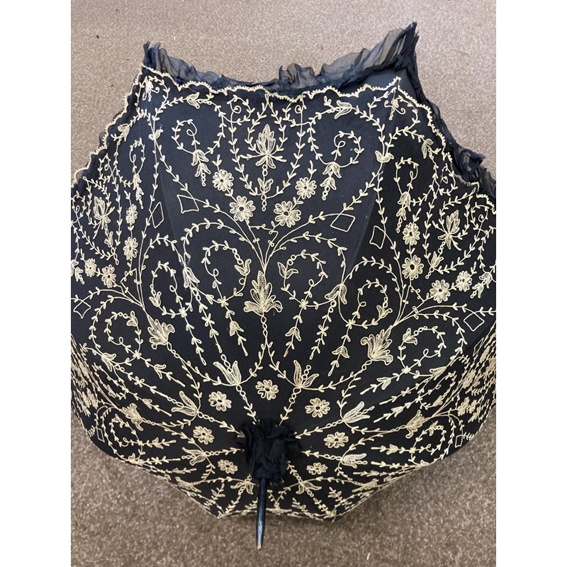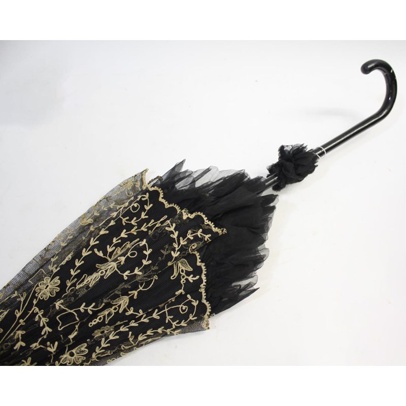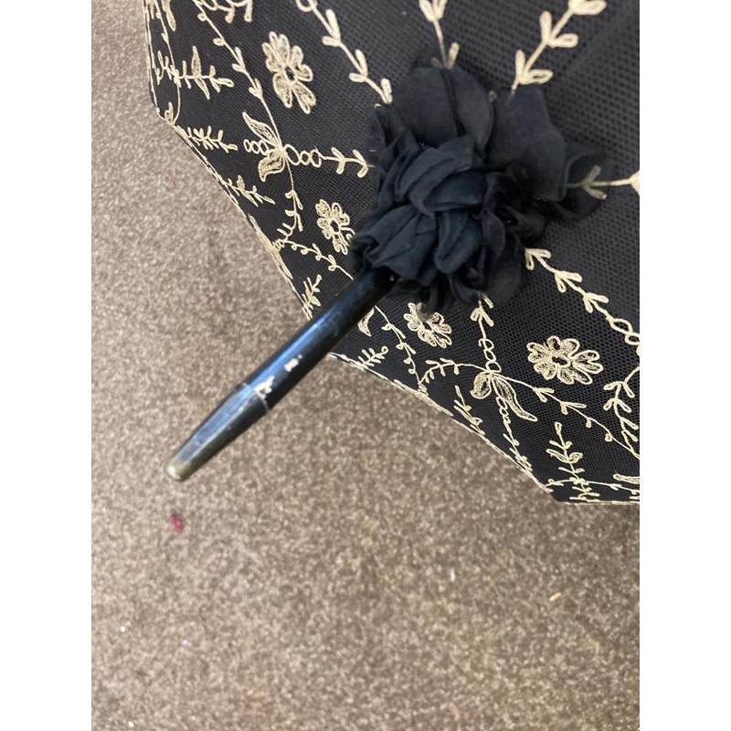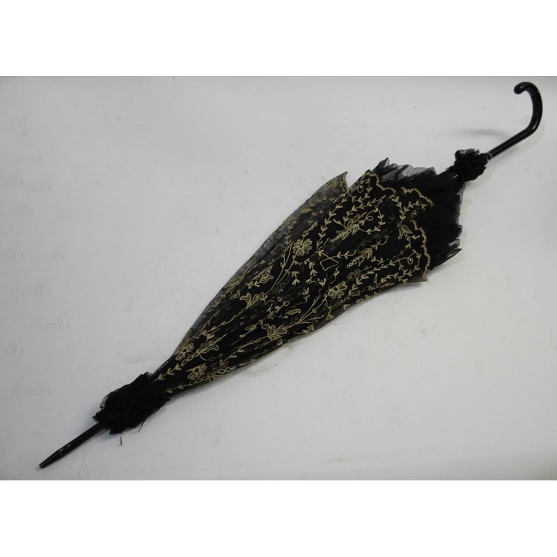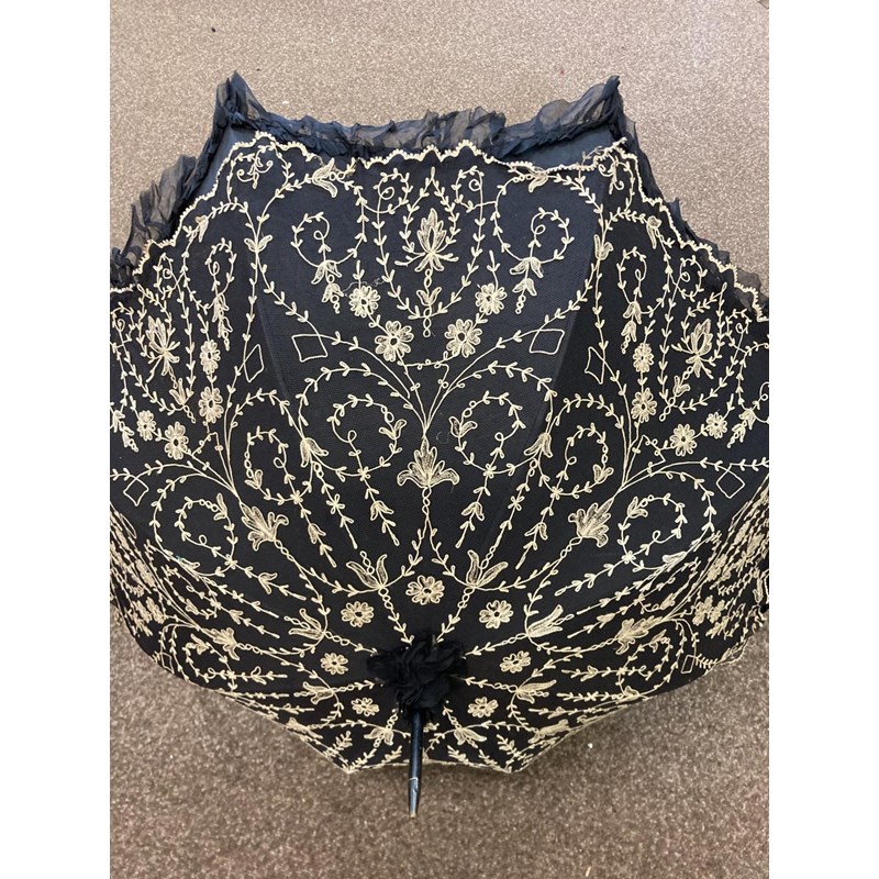 VICTORIAN LACE PARASOL a black and cream silk parasol with a wooden handle.