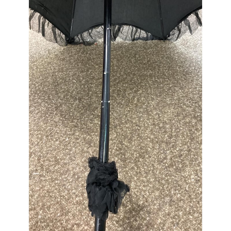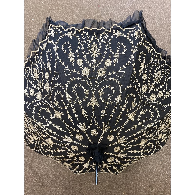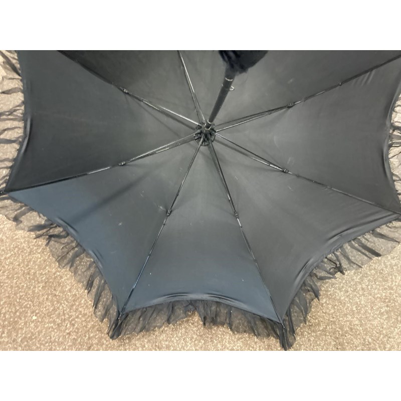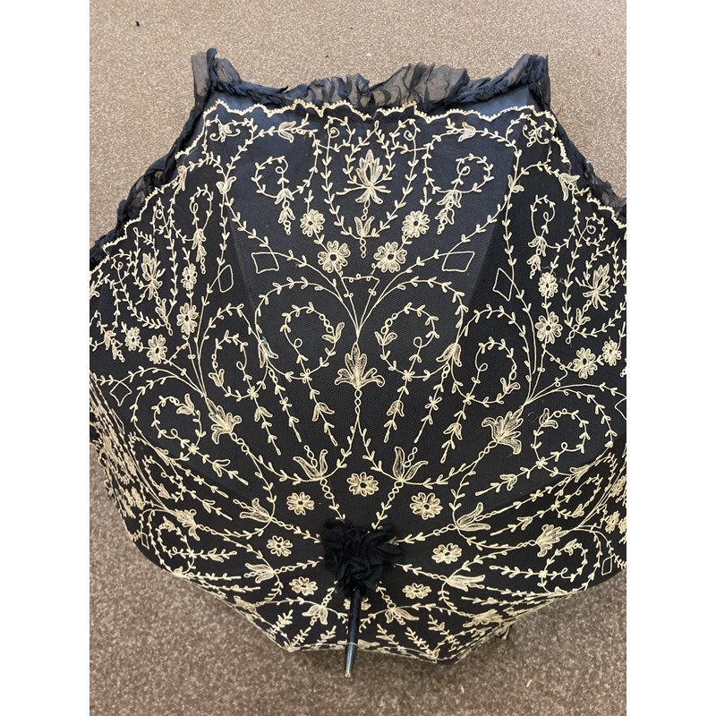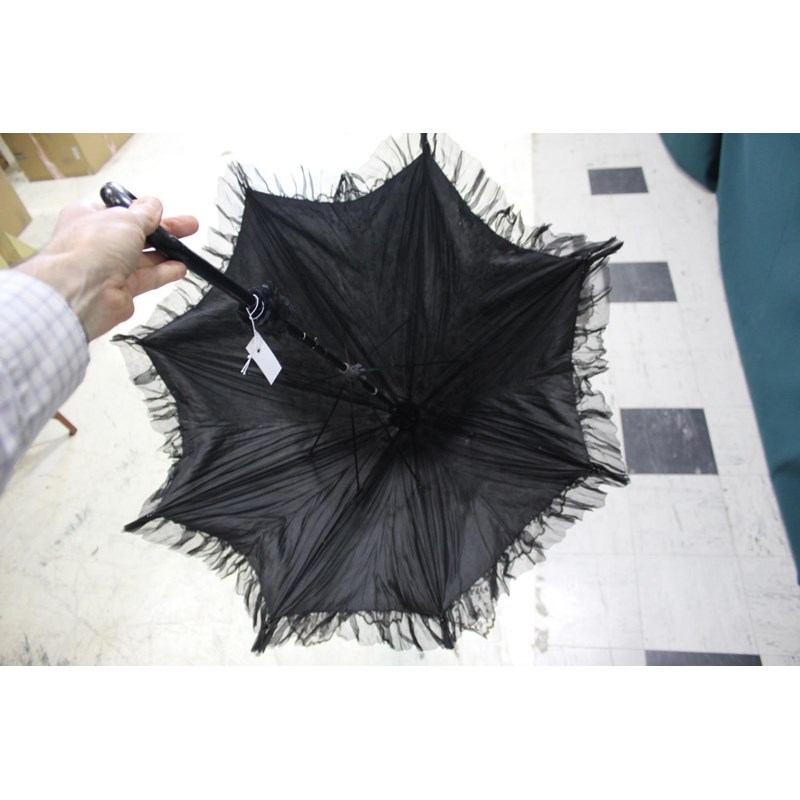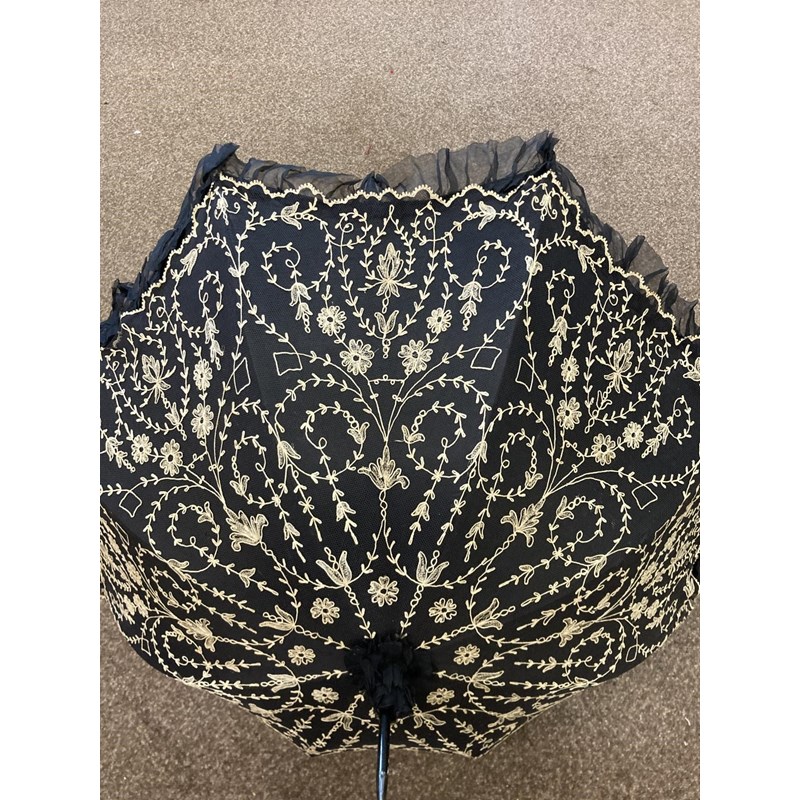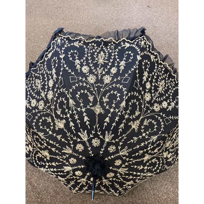 VICTORIAN LACE PARASOL a black and cream silk parasol with a wooden handle.