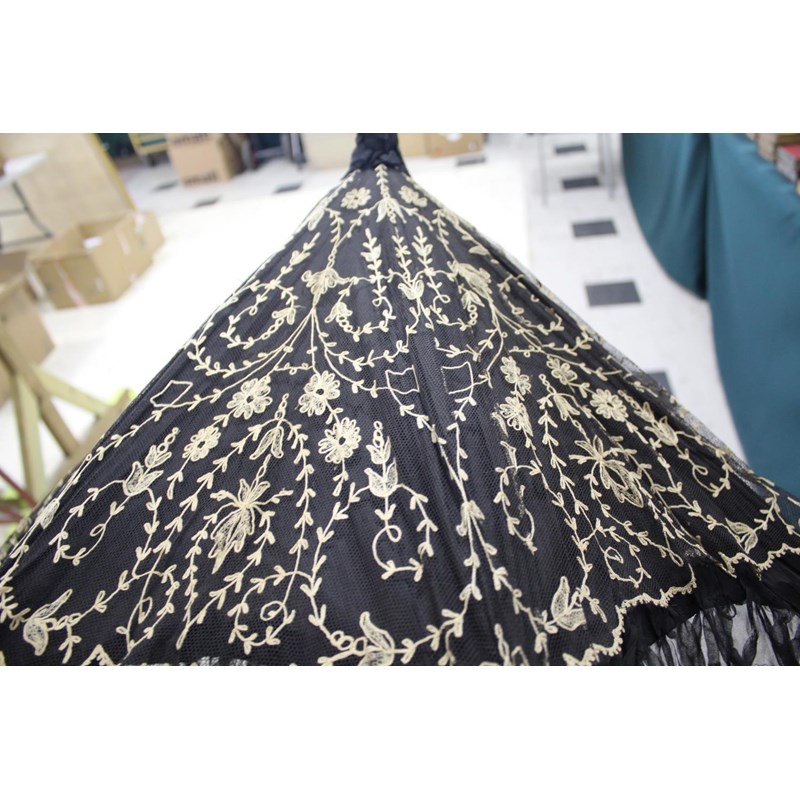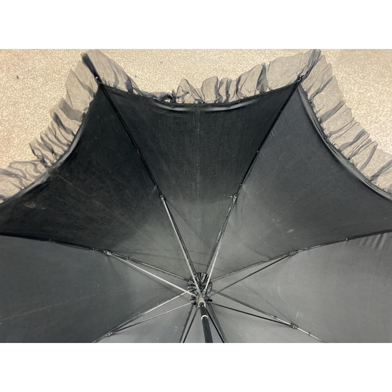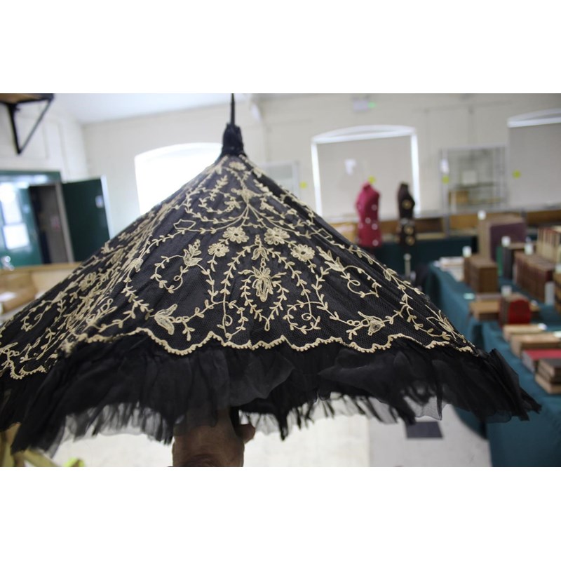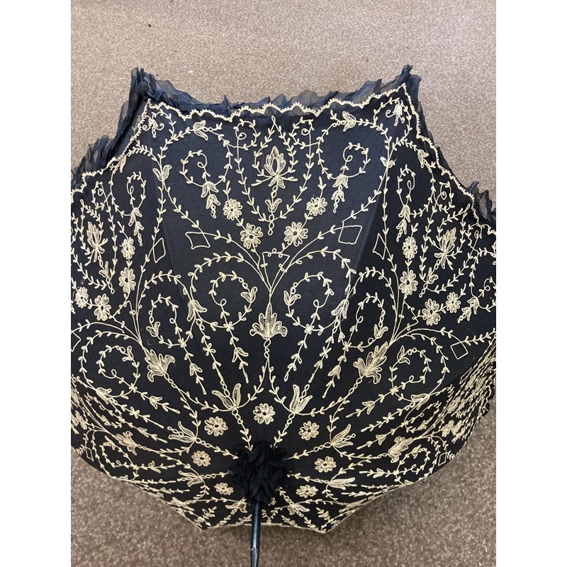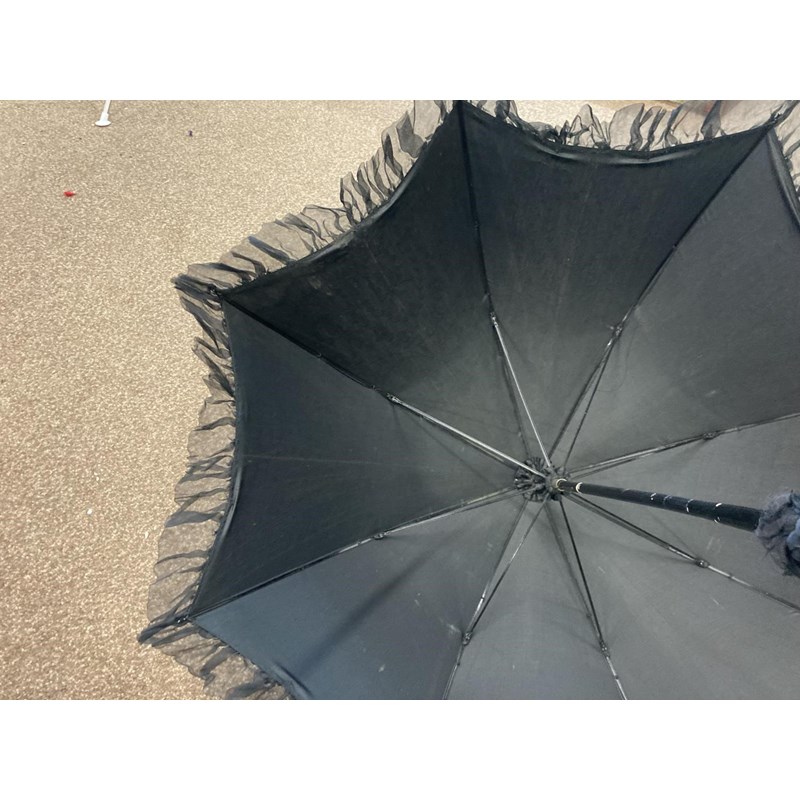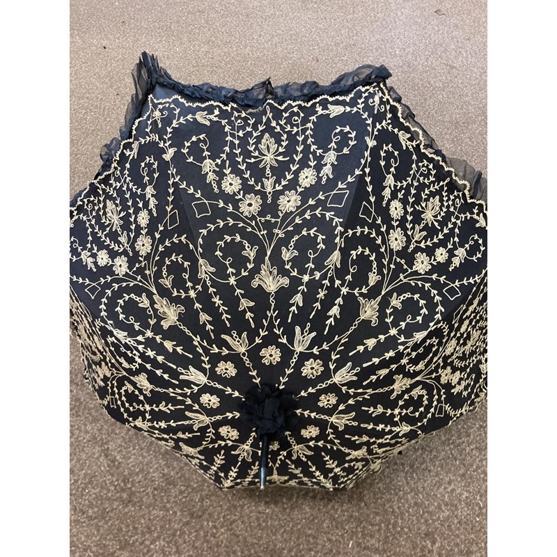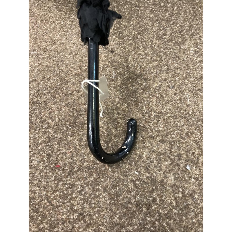 VICTORIAN LACE PARASOL a black and cream silk parasol with a wooden handle.