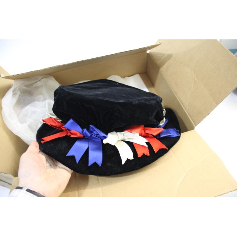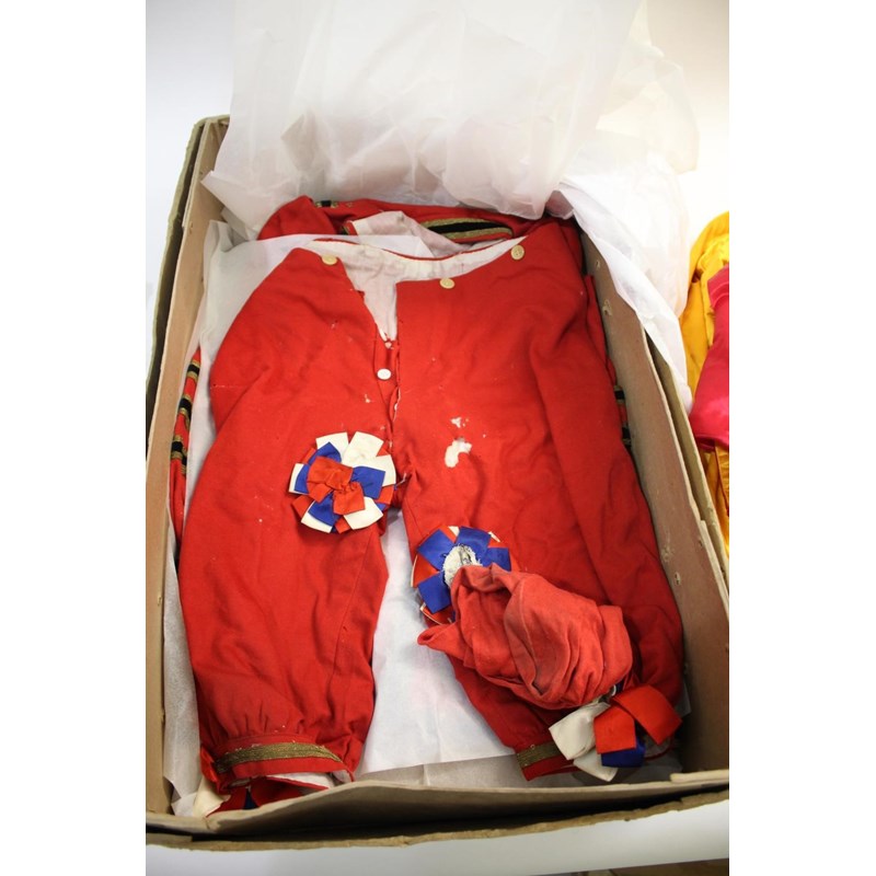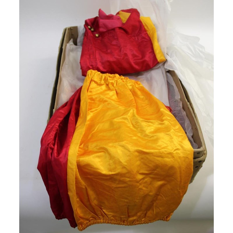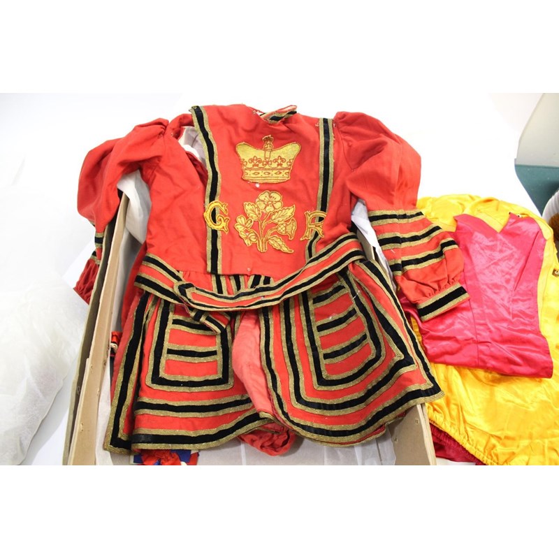 EARLY 20THC FANCY DRESS COSTUMES including a red and yellow silk jester's costume, and a red wool Beefeater costume with a black velvet hat. (2)