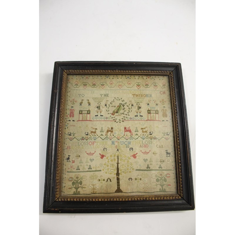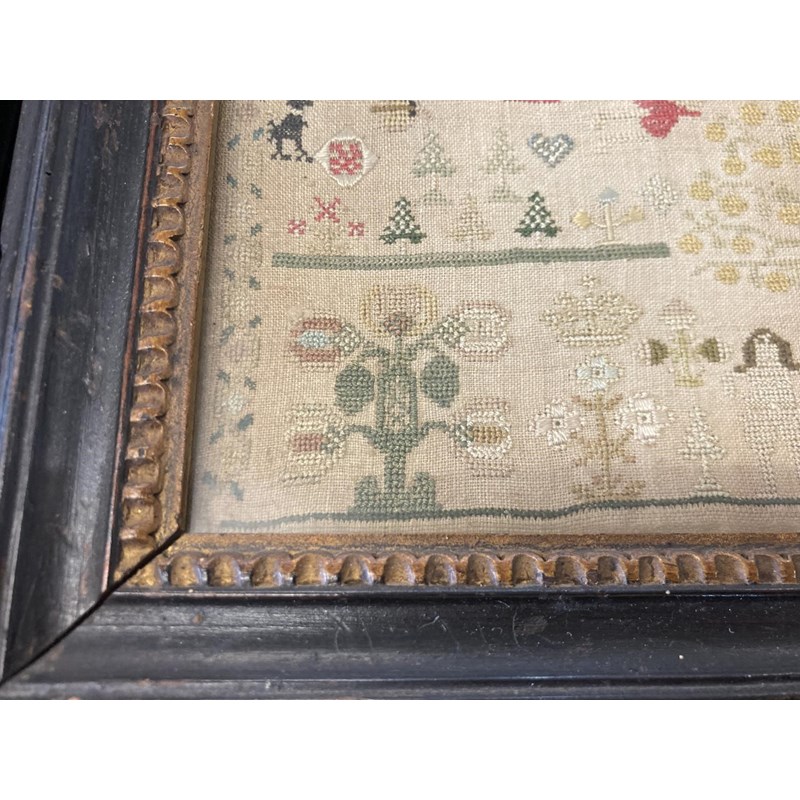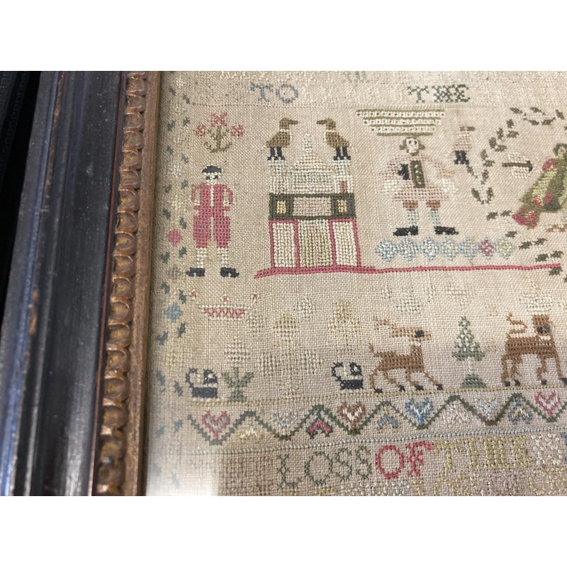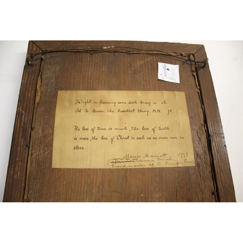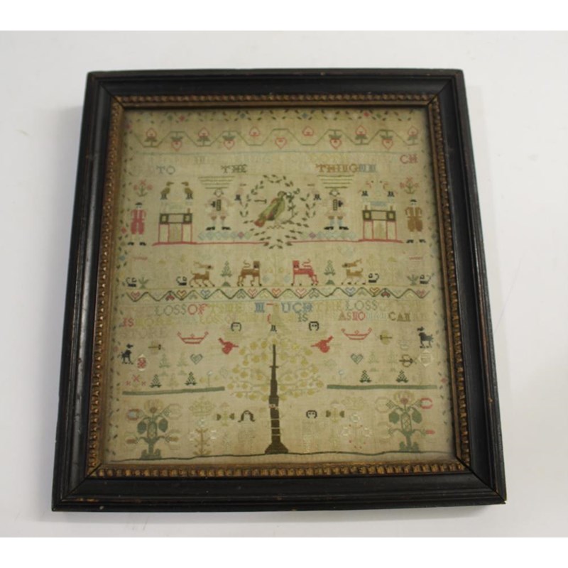 dated 1778, with the prose Delight in learning soon doth bring a child to learn the hardest thing, embroidered with animals, birds and figures. With a written label to the reverse with various information including Maria Marriott, 1778. In an ebonised frame, 24cms by 21cms, frame 29cms by 27cms
