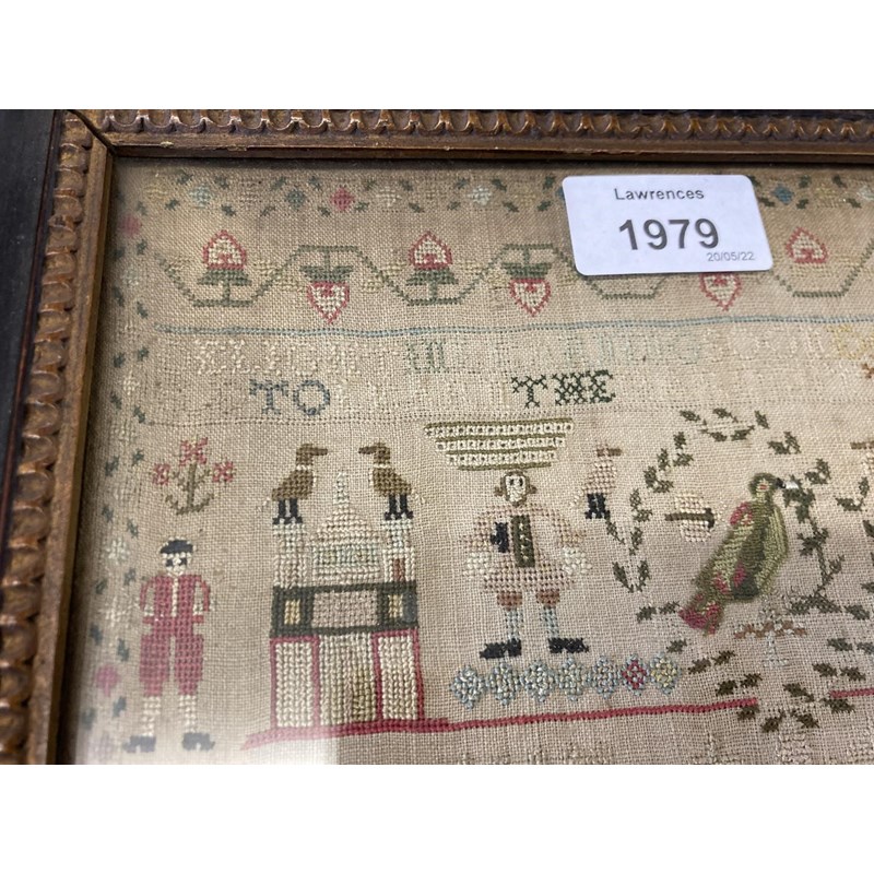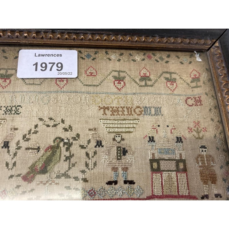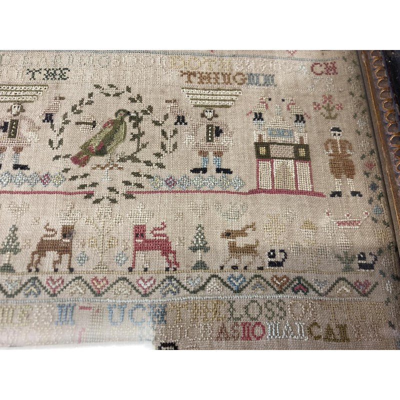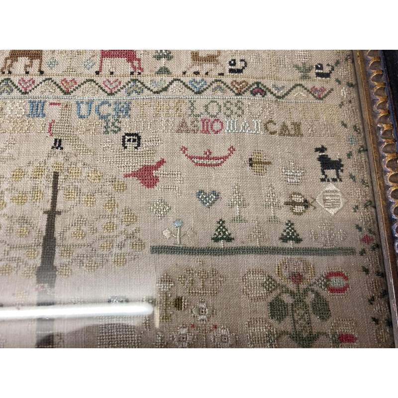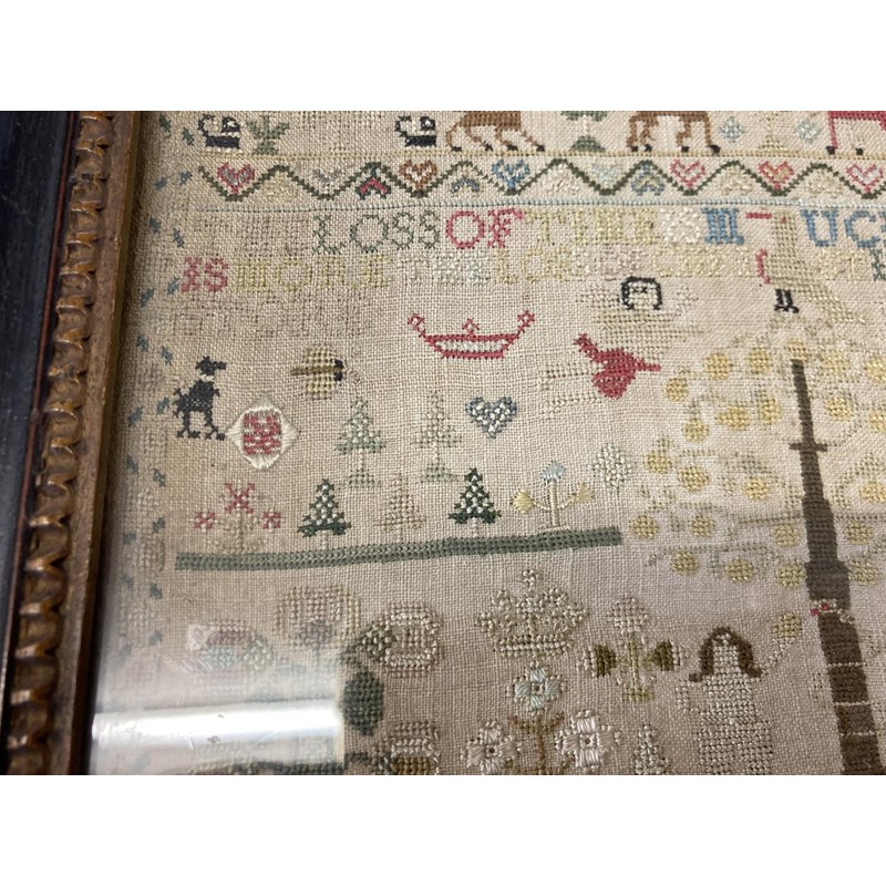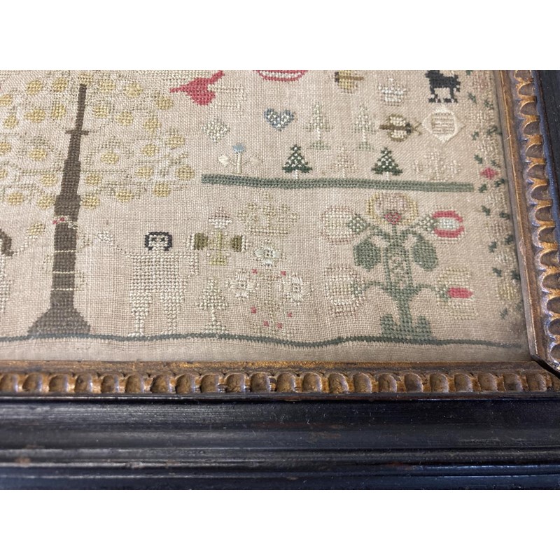 dated 1778, with the prose Delight in learning soon doth bring a child to learn the hardest thing, embroidered with animals, birds and figures. With a written label to the reverse with various information including Maria Marriott, 1778. In an ebonised frame, 24cms by 21cms, frame 29cms by 27cms