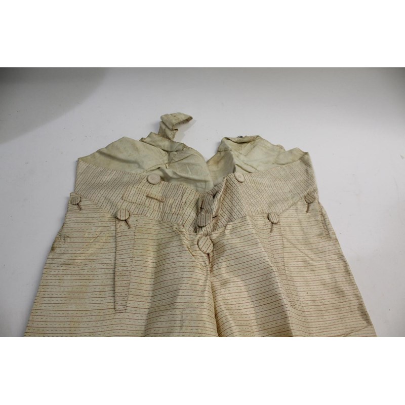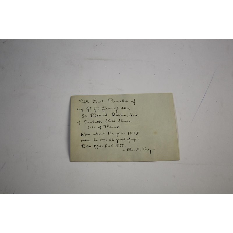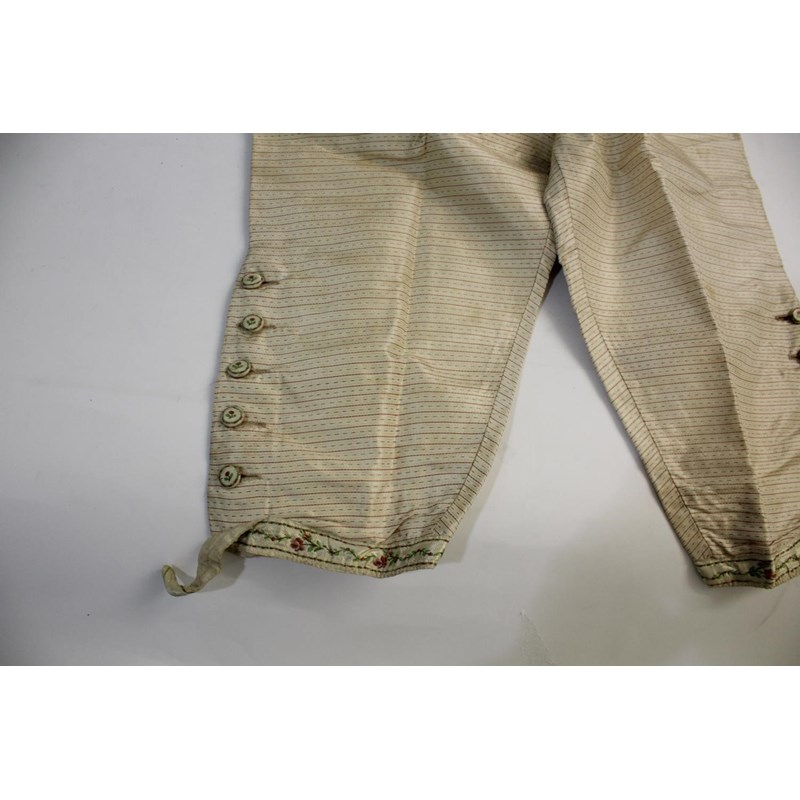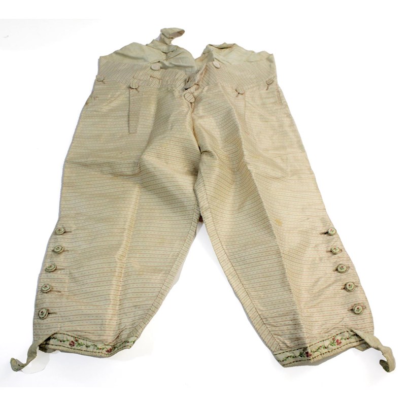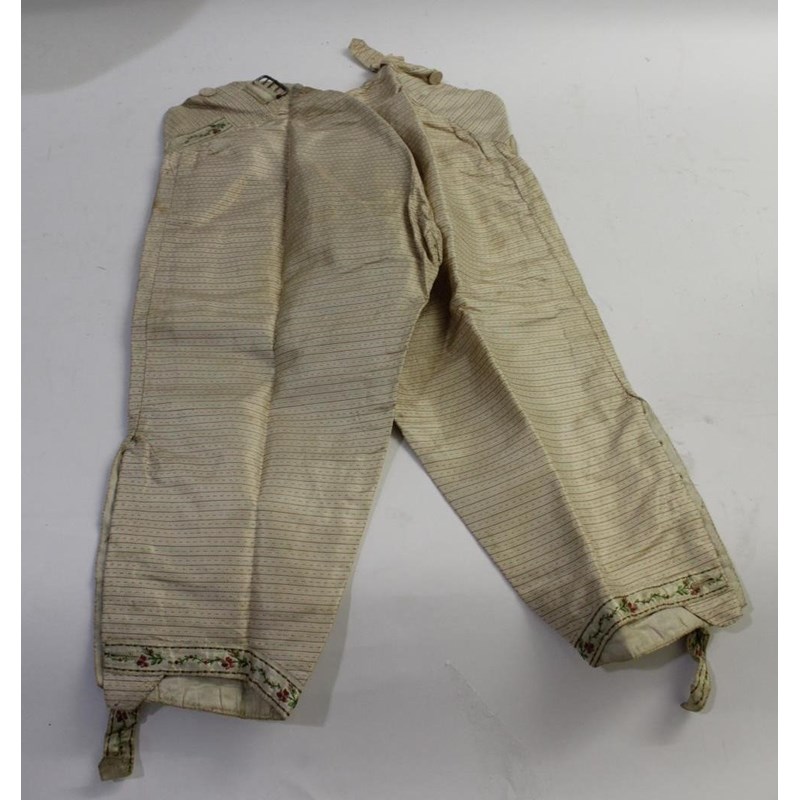 circa 1825, a pair of silk breeches worn by Sir Robert Burton of Sacketts Hill House (with accompanying provenance). With flower head buttons and a border of flowers around the hem. 69cms high