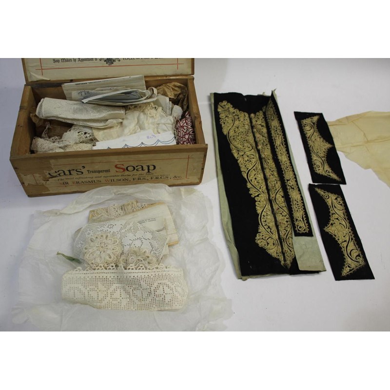 a Pear's Soap box containing a collection of late 19thc and early 20thc lace and crochet trimmings, a baby bonnet, a folder of Weldon's needlework magazines and similar items, a tin of knitting pins etc, and an unused Turkish gold embroidered jacket front, collar and cuffs.