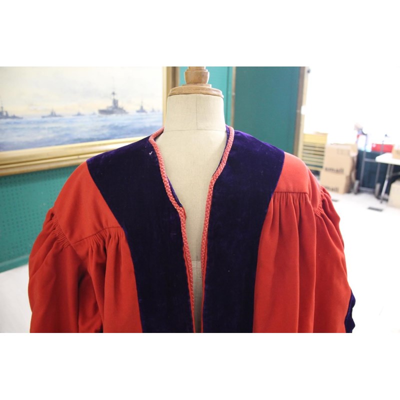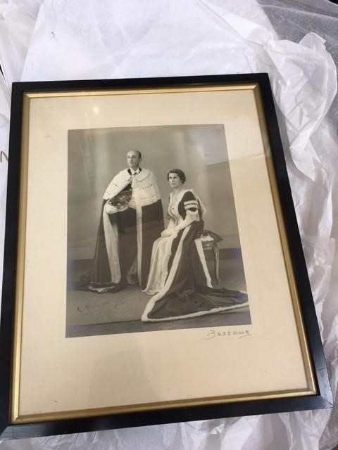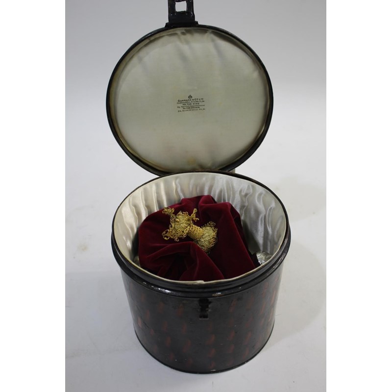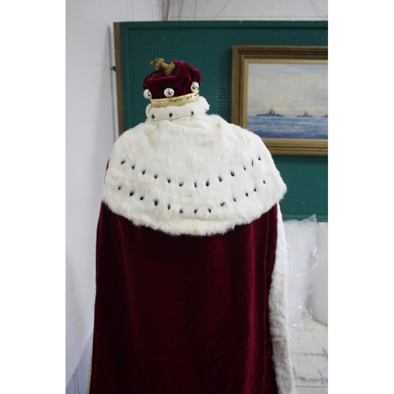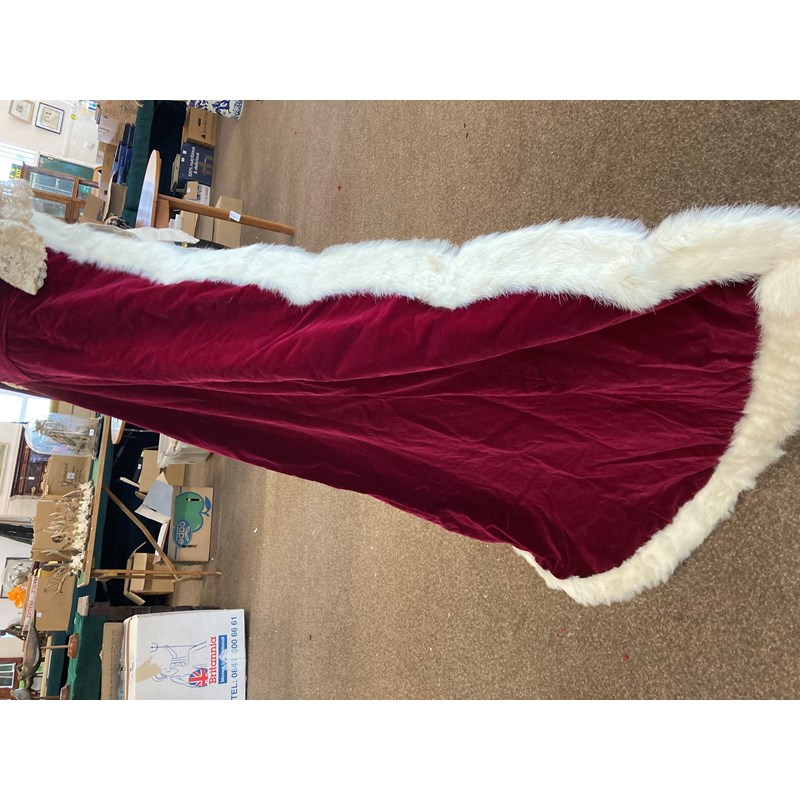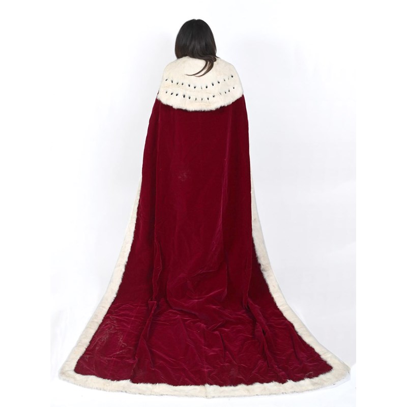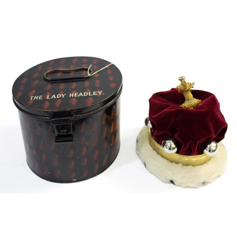 a wonderful set of George VI Coronation robes worn by Lady Baroness Headley, comprising a crimson silk velvet cloak trimmed with ermine, an ivory silk dress, a full length close fitting velvet robe with short fitted sleeves trimmed with lace. Also with a coronet within a silk lined Garrard & Co tin case. Also with a set of House of Lords robes, with scarlet wool trimmed with bands of purple silk velvet belonging to Baron Headley.