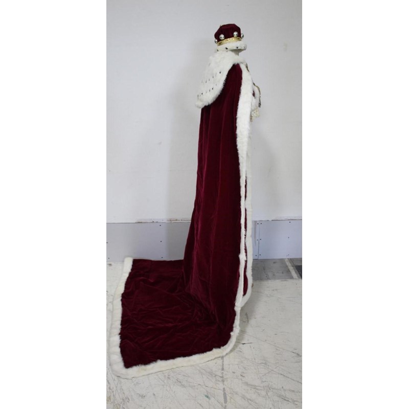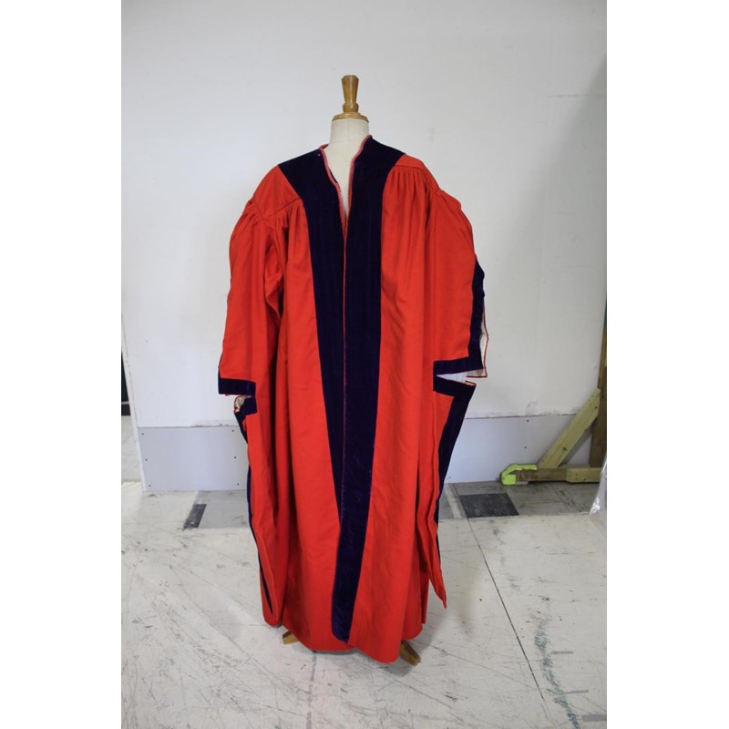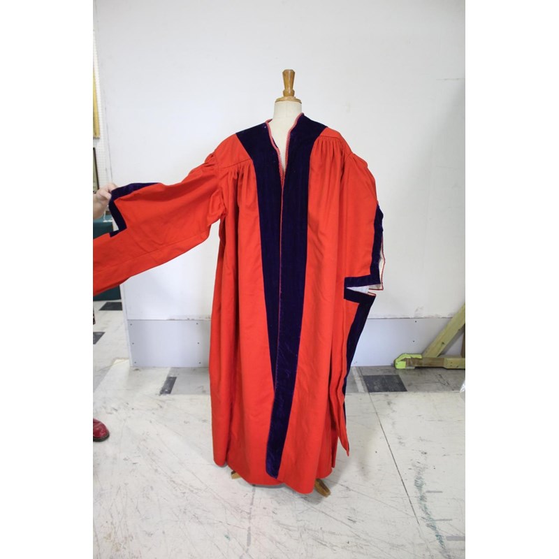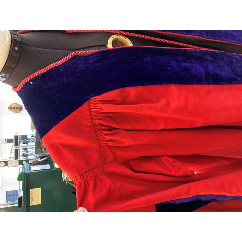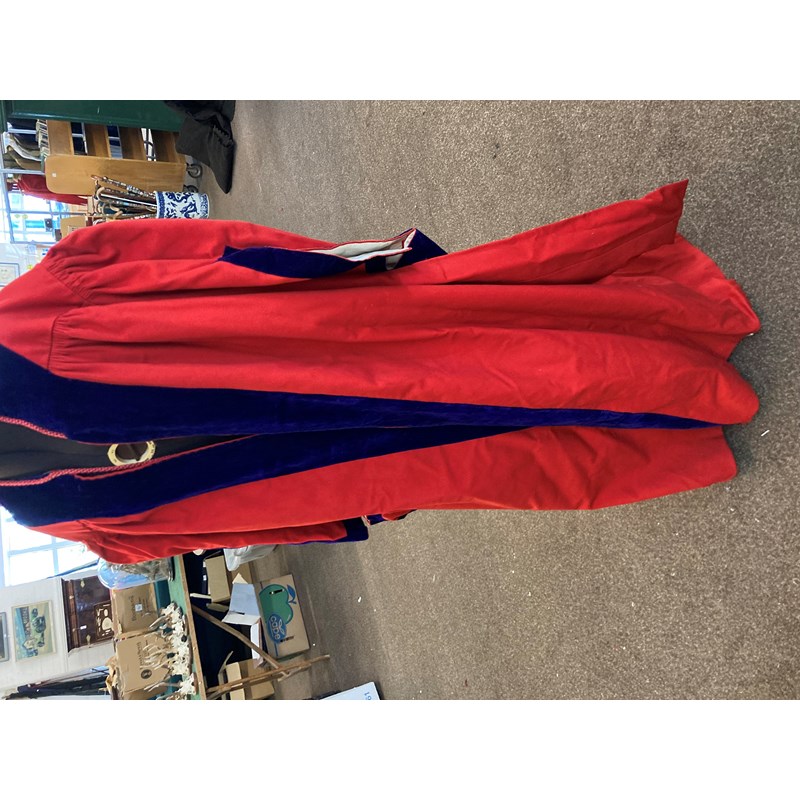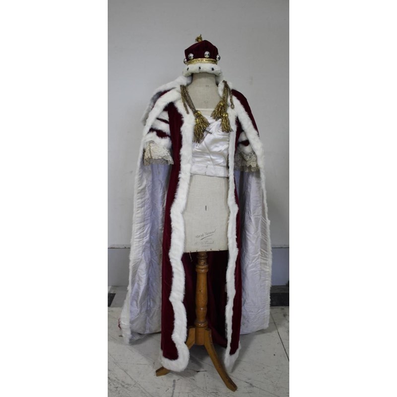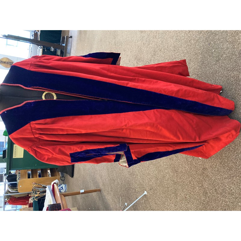 a wonderful set of George VI Coronation robes worn by Lady Baroness Headley, comprising a crimson silk velvet cloak trimmed with ermine, an ivory silk dress, a full length close fitting velvet robe with short fitted sleeves trimmed with lace. Also with a coronet within a silk lined Garrard & Co tin case. Also with a set of House of Lords robes, with scarlet wool trimmed with bands of purple silk velvet belonging to Baron Headley.