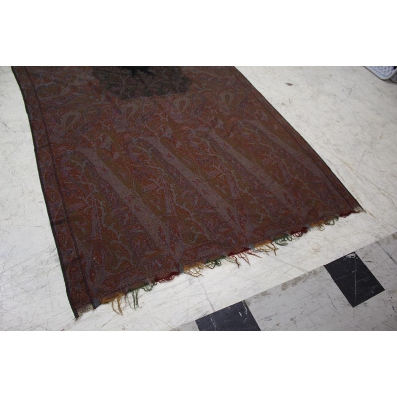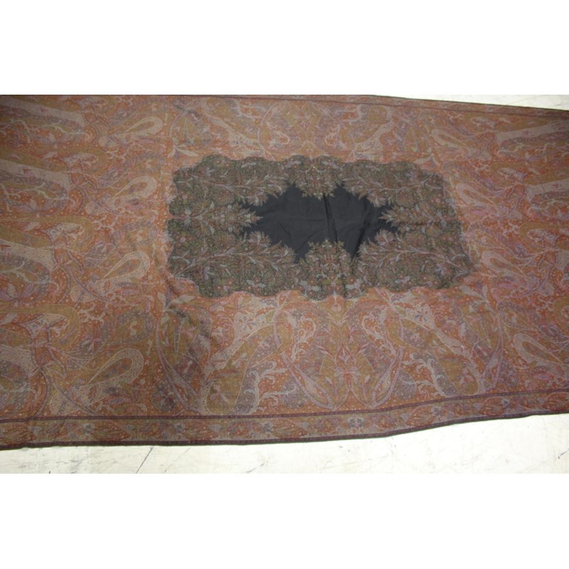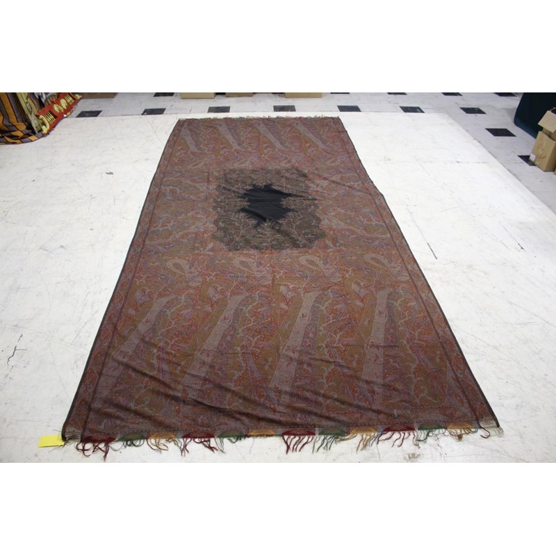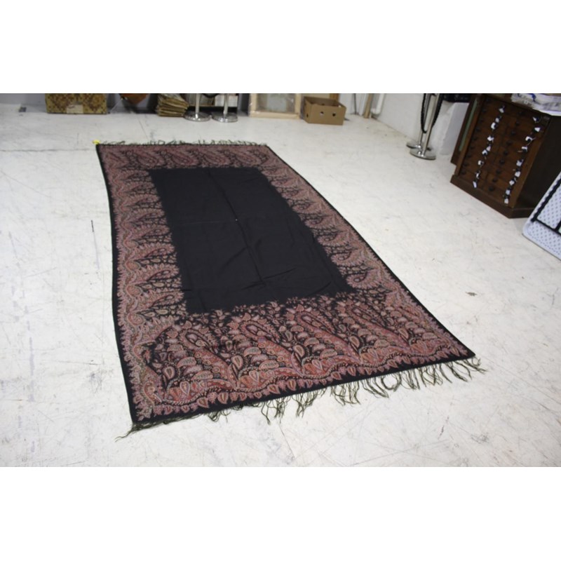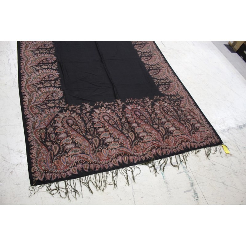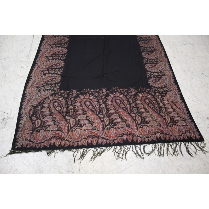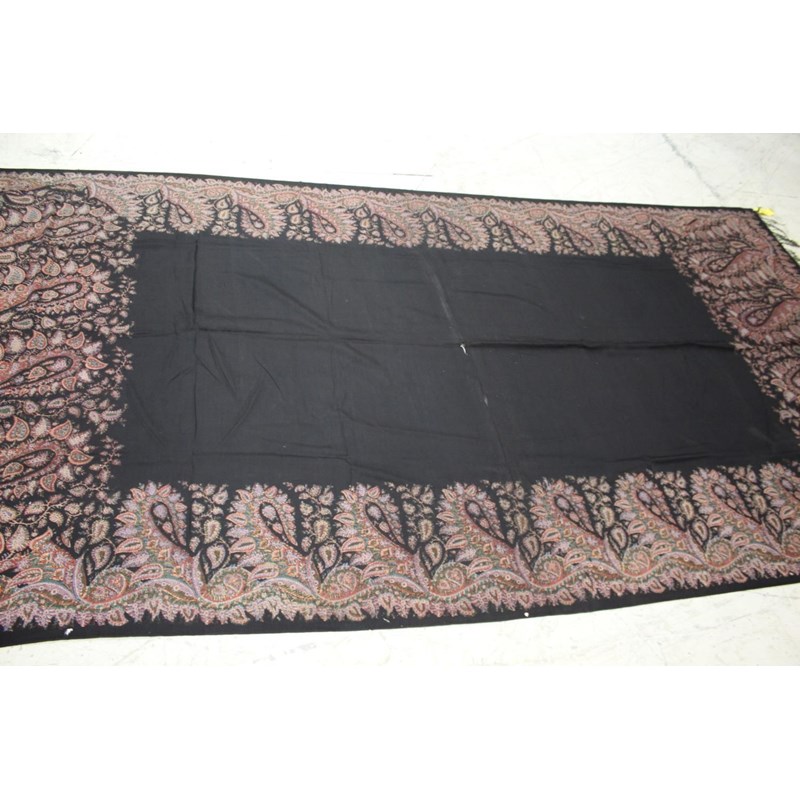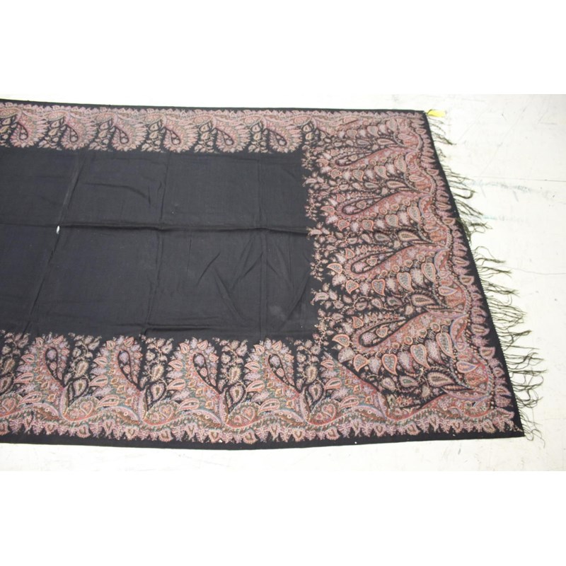 KASHMIR SHAWL a late 19thc printed paisley shawl with black wool fringing, 165cms x 3m, some holes and moth damage. Also with a woven woollen paisley shawl, 160cms by 3.5m, some thinning to the fabric. (2)
