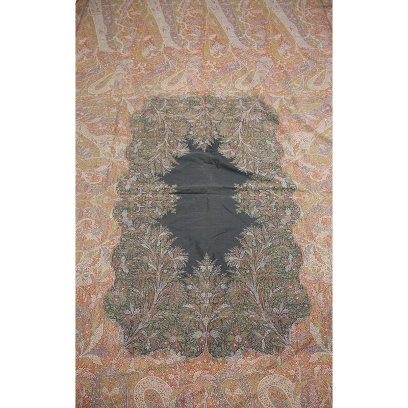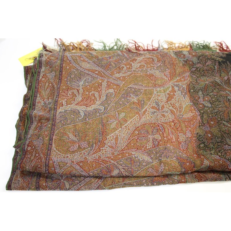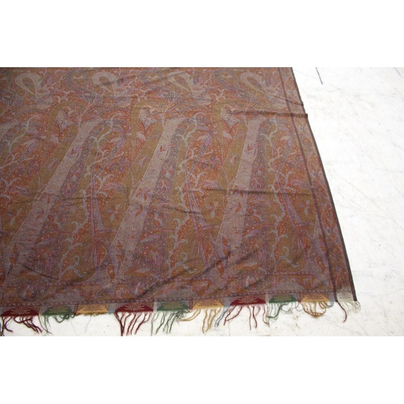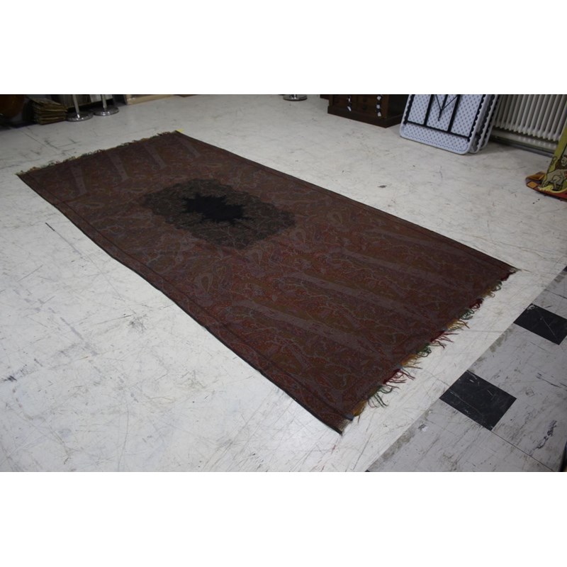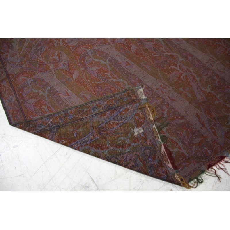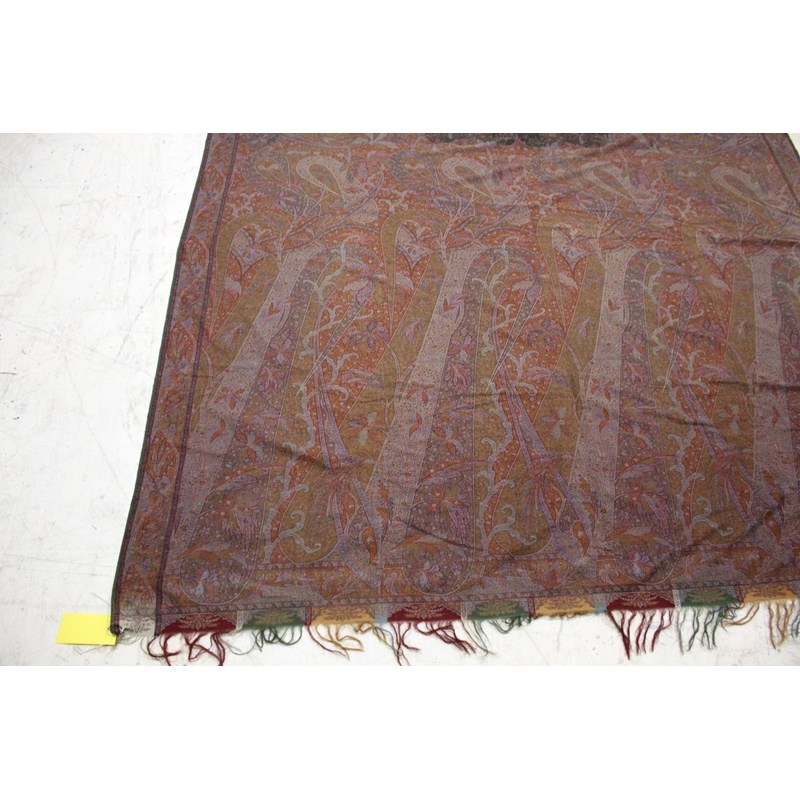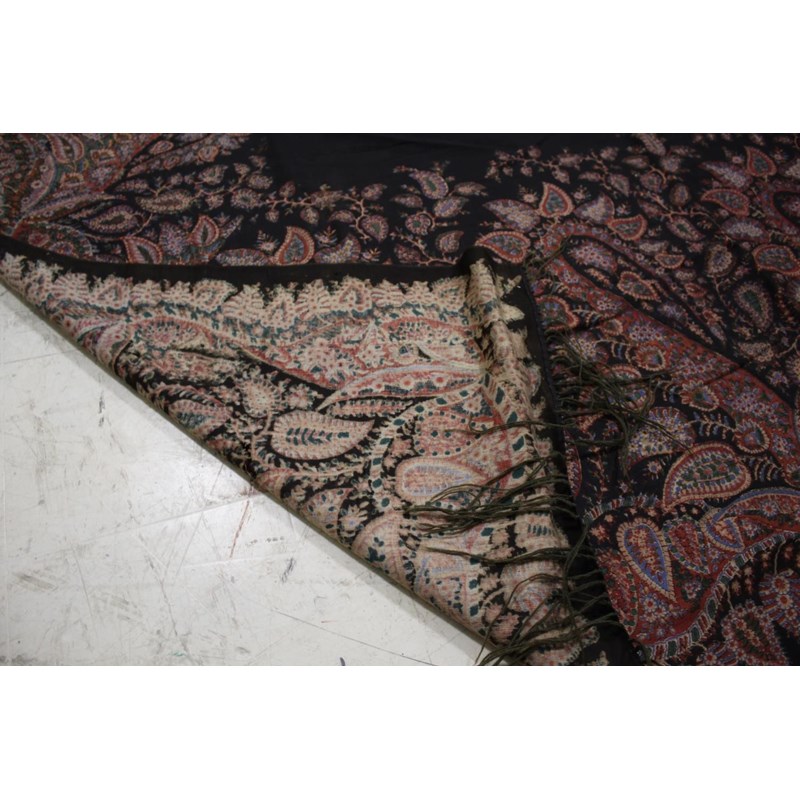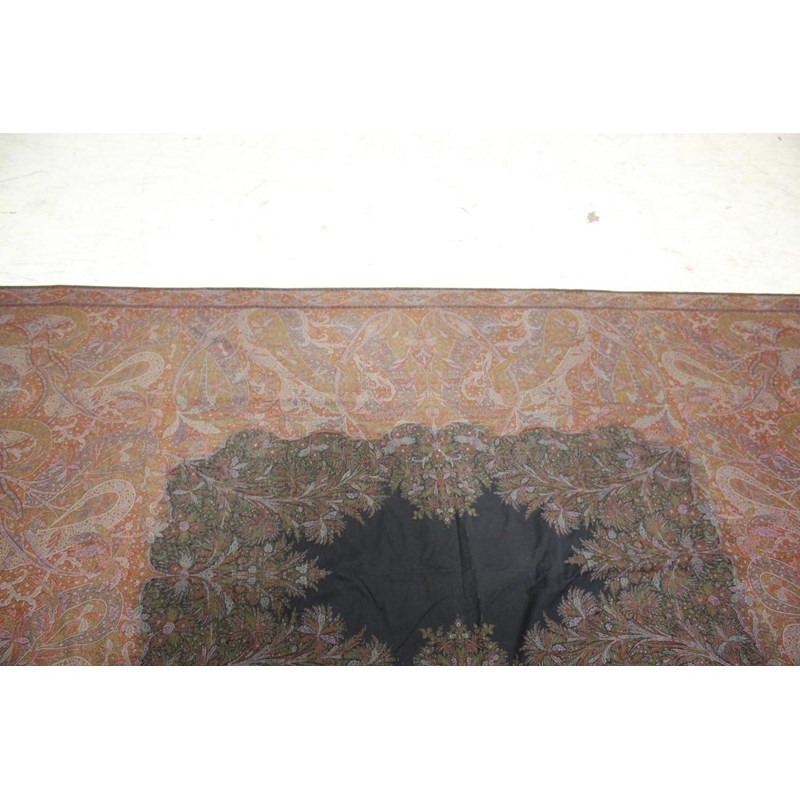 KASHMIR SHAWL a late 19thc printed paisley shawl with black wool fringing, 165cms x 3m, some holes and moth damage. Also with a woven woollen paisley shawl, 160cms by 3.5m, some thinning to the fabric. (2)