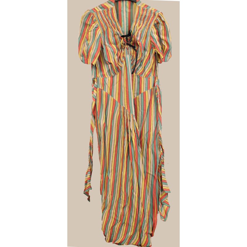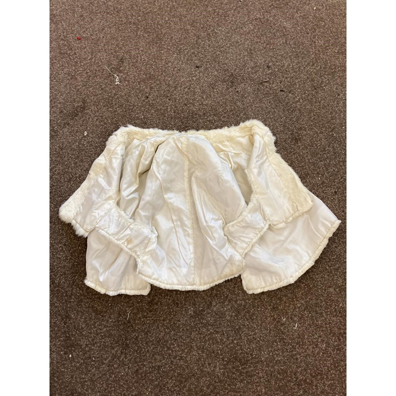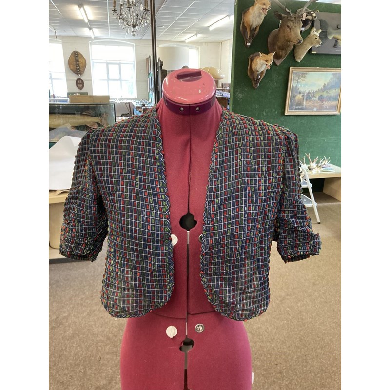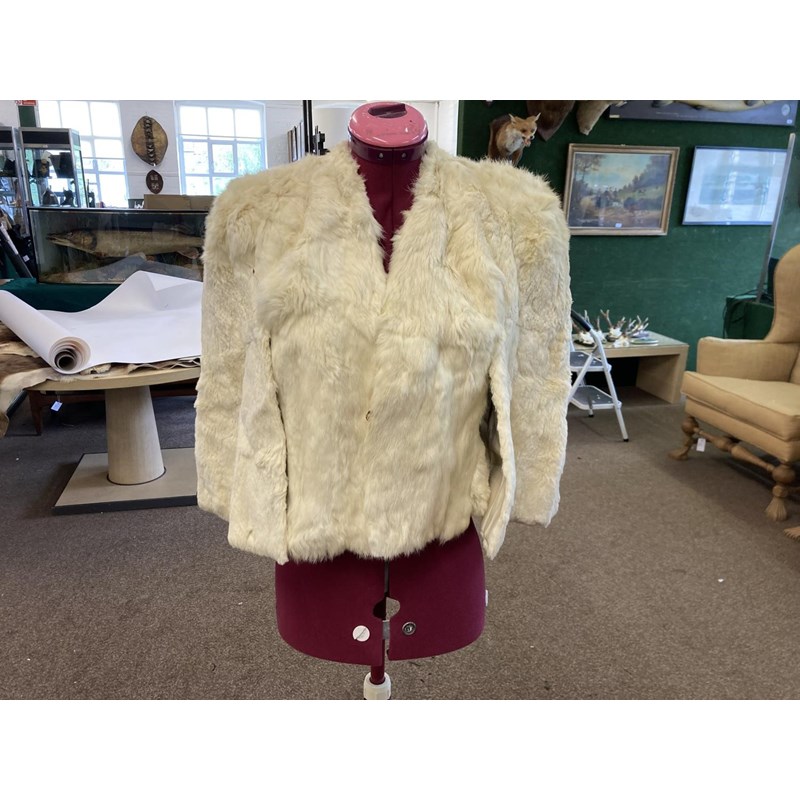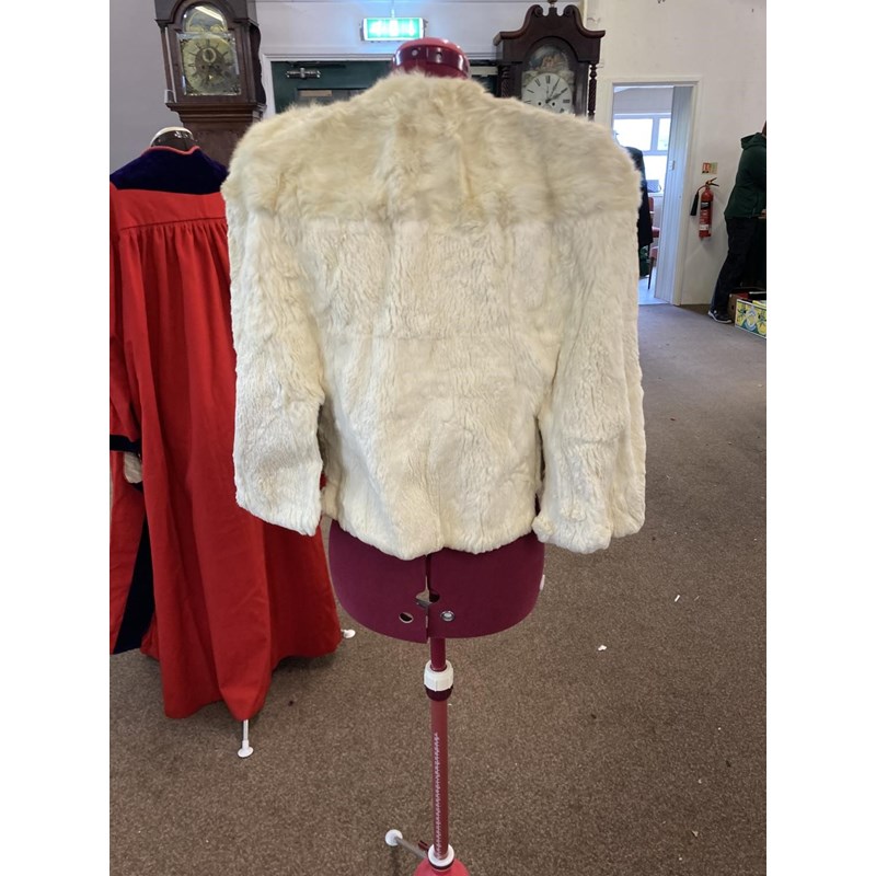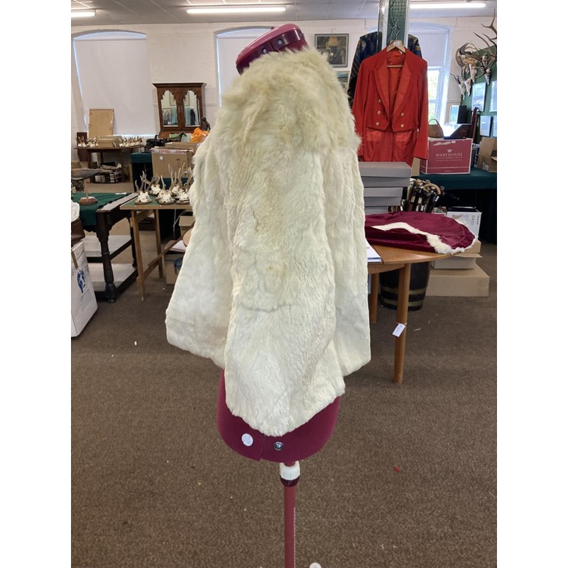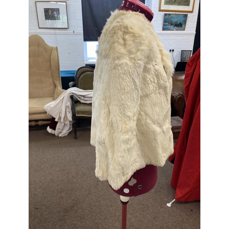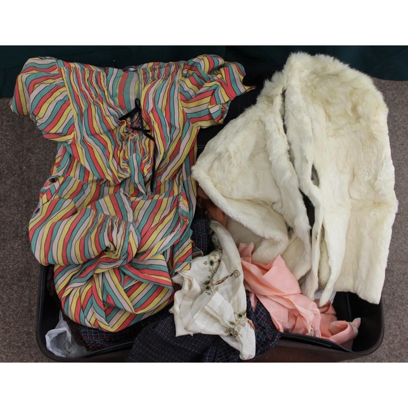 including a 1930's striped dress (119cms high), a navy blue cocktail dress and matching jacket with devore detail, a full length satin slip, a white fur evening cape and textiles.