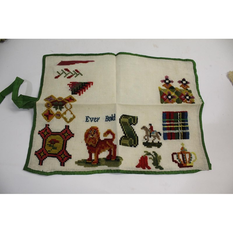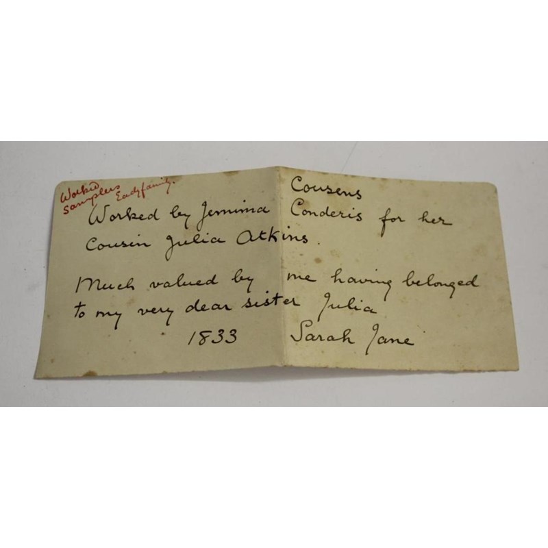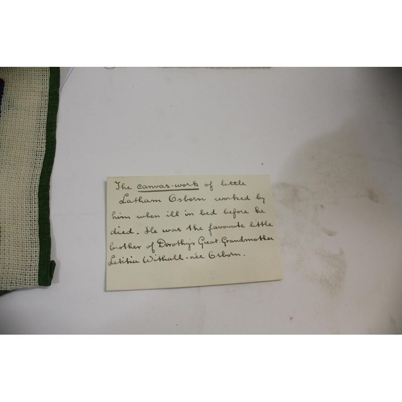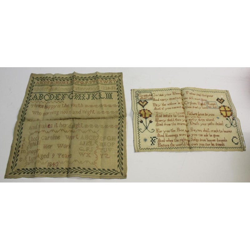 UNFRAMED SAMPLER - 1843 worked by a 9 year old Caroline Wort, an unframed sampler of a similar date (both with damages and holes), and a canvas work piece worked by Latham Osborn and a small cross stitch. (4)