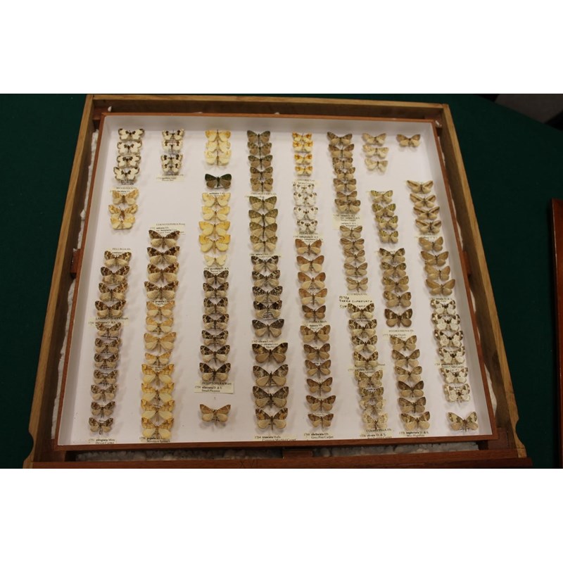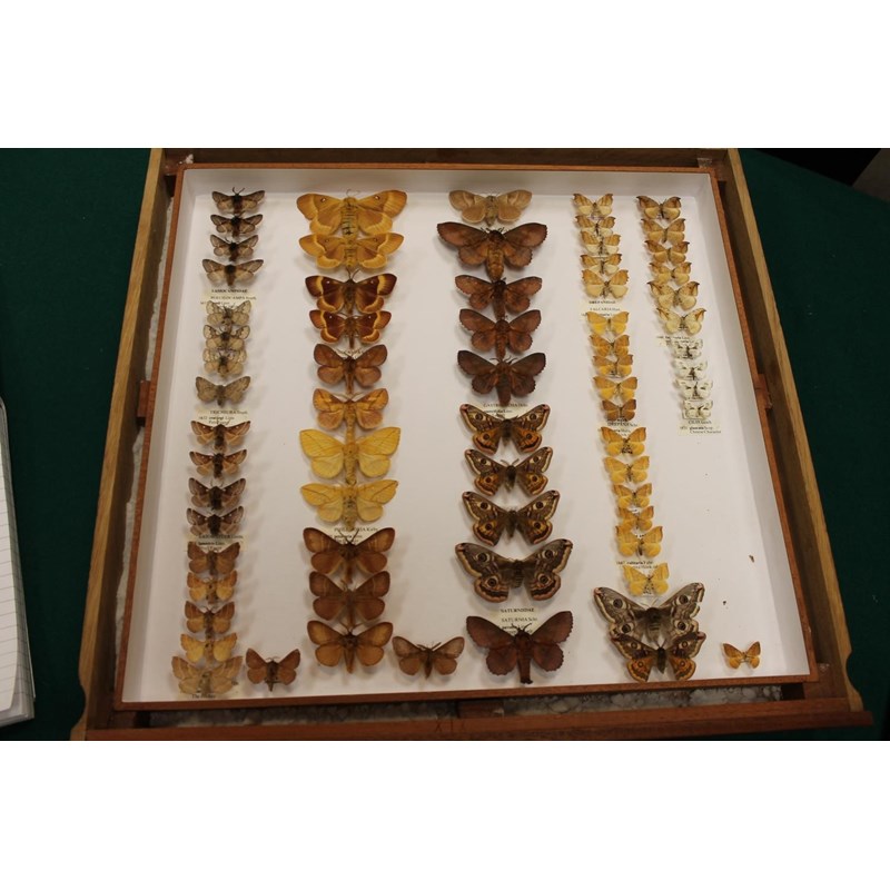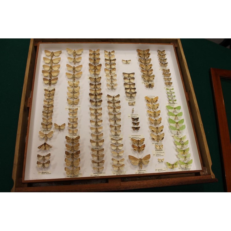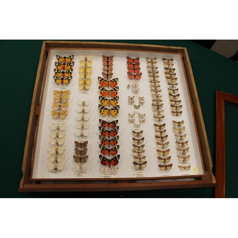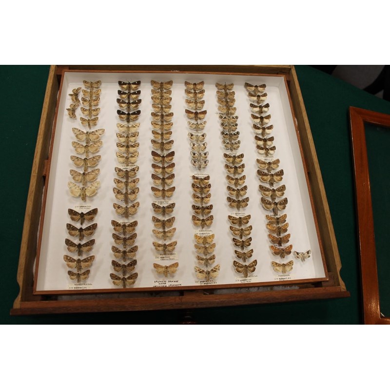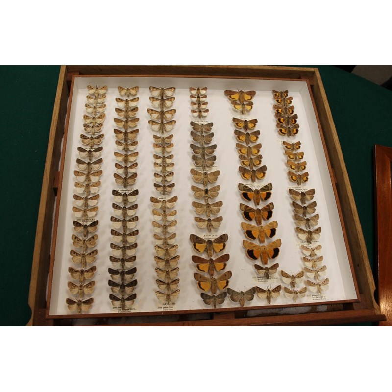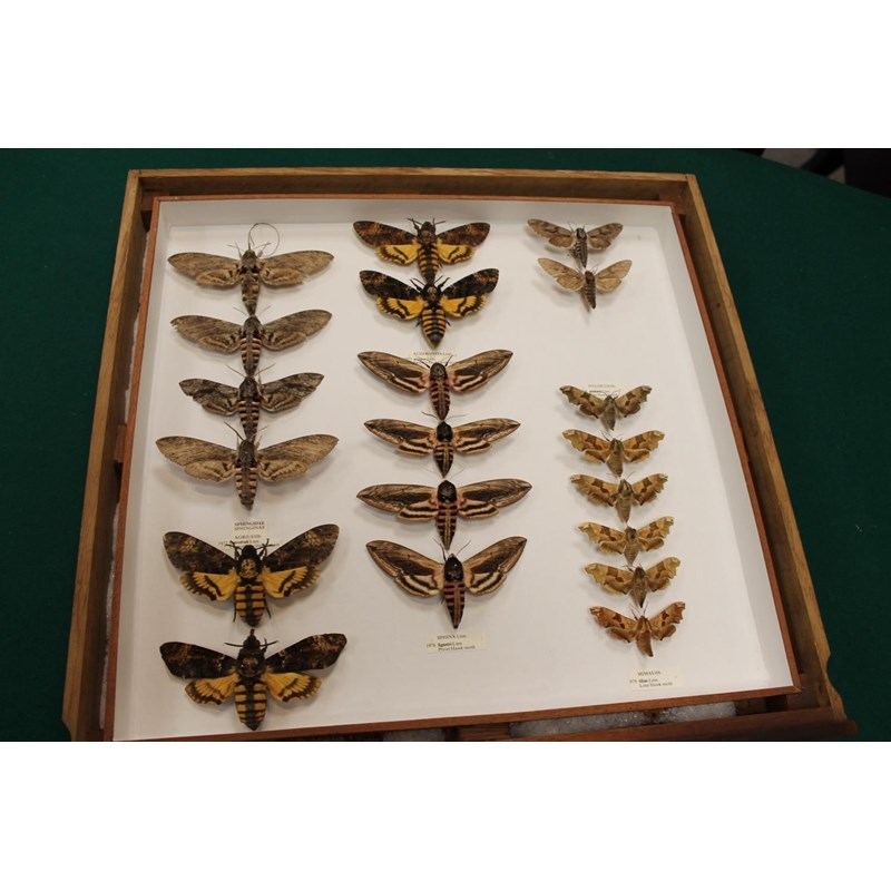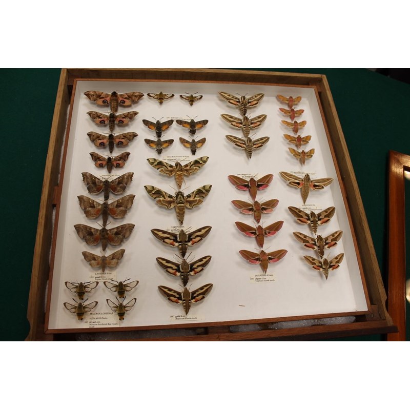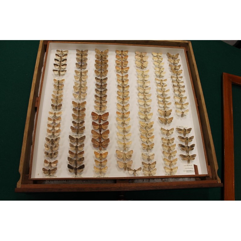 a 19thc mahogany cabinet with an upper shelf with brass frieze and supported on columns, the bottom section with 20 numbered glazed drawers with a variety of moth and butterfly specimens, many with information and dates. Specimens include Hawk Moth, Lime Hawk Moth, Elephant Hawk Moth, Humming Bird Hawk Moth, Lobster Moth, Puss Moth, Marbled Brown, Garden Tiger, Yellow Tail, Rosy Footman, Jersey Tiger, Garden Dart, Clouded Buff, Turnip Moth, Heath Rustic, Double Dart, Purple Clay, Dot Moth, Hedge Rustic, Small Quaker, Dark Brocade, Black Rustic, Lunar Underwing, Grey Dagger, Lesser Spotted Pinion, Copper Underwing, Large Nutmeg, Mother Shipton, Grass Emerald, Chalk Carpet, Pale Eggar, Brown Scallop, Green Silver Lines, Webb's Wainscot, and many more. Cabinet 128cms high, 94cms across, 51cms deep