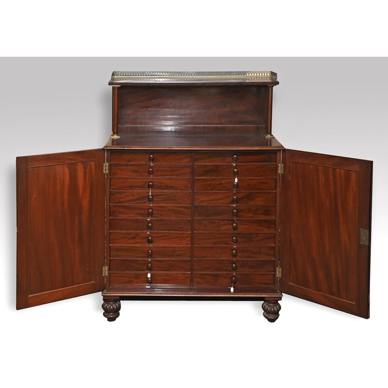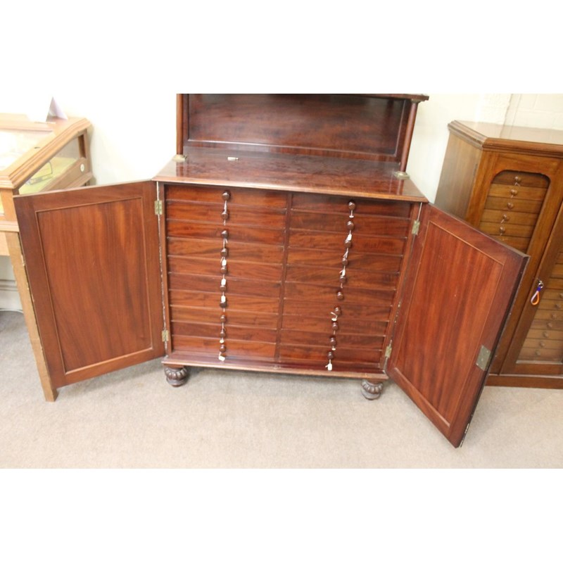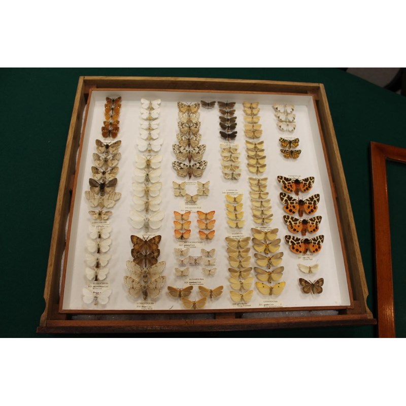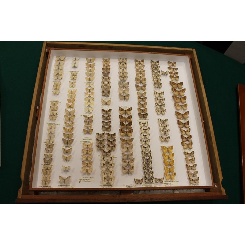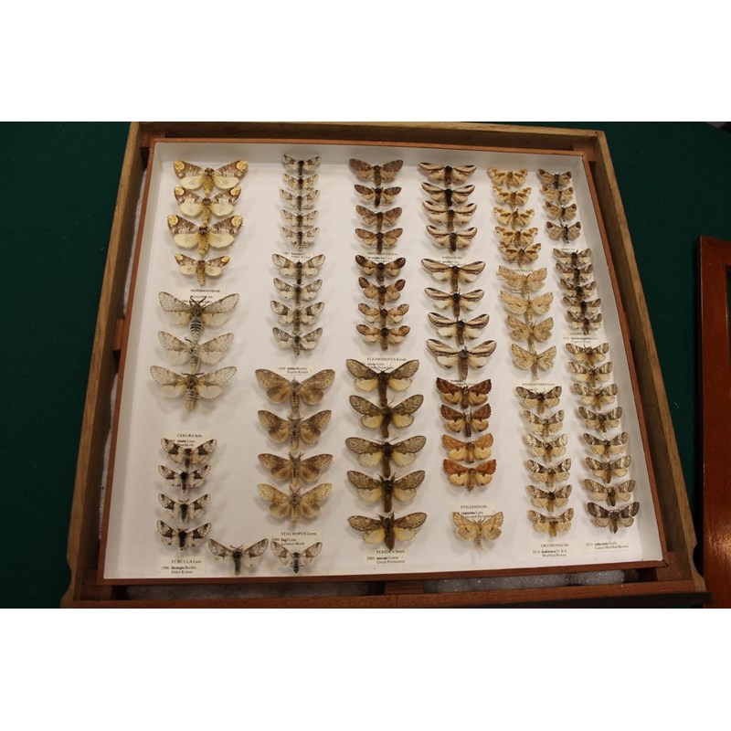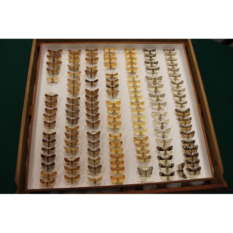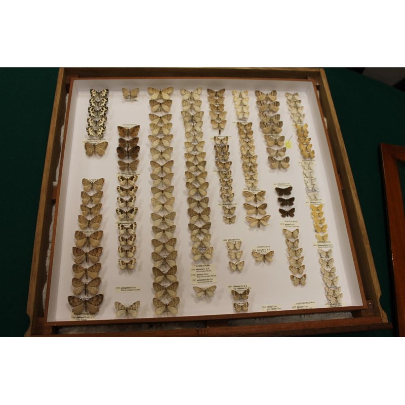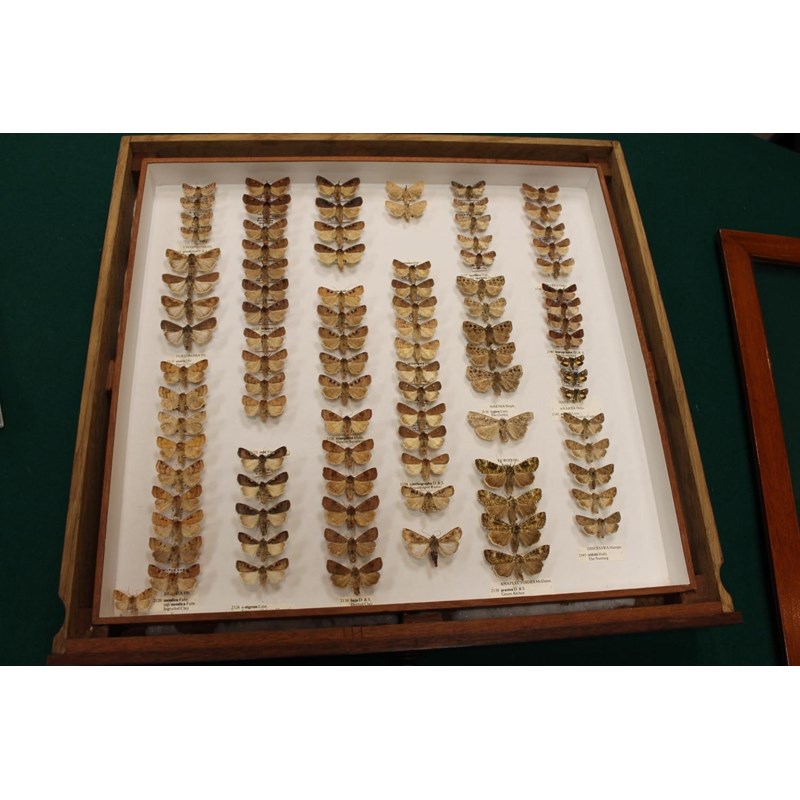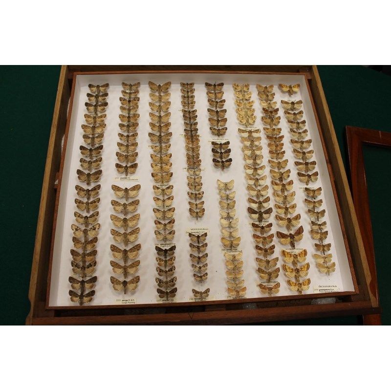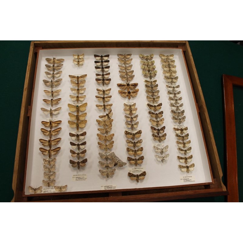 a 19thc mahogany cabinet with an upper shelf with brass frieze and supported on columns, the bottom section with 20 numbered glazed drawers with a variety of moth and butterfly specimens, many with information and dates. Specimens include Hawk Moth, Lime Hawk Moth, Elephant Hawk Moth, Humming Bird Hawk Moth, Lobster Moth, Puss Moth, Marbled Brown, Garden Tiger, Yellow Tail, Rosy Footman, Jersey Tiger, Garden Dart, Clouded Buff, Turnip Moth, Heath Rustic, Double Dart, Purple Clay, Dot Moth, Hedge Rustic, Small Quaker, Dark Brocade, Black Rustic, Lunar Underwing, Grey Dagger, Lesser Spotted Pinion, Copper Underwing, Large Nutmeg, Mother Shipton, Grass Emerald, Chalk Carpet, Pale Eggar, Brown Scallop, Green Silver Lines, Webb's Wainscot, and many more. Cabinet 128cms high, 94cms across, 51cms deep